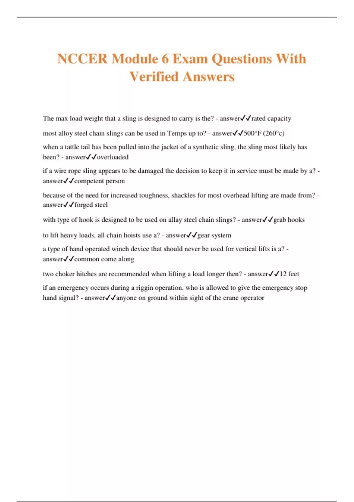 NCCER Module 6 Exam Questions With Verified Answers The max load weight that a sling is designed to carry is the? - answerrated capacity most alloy steel chain slings can be used in Temps up to? - answer500°F (260°c) when a tattle tail has been pulled into the jacket of a synthetic sling, the sling most likely has been? - answeroverloaded if a wire rope sling appears to be damaged the decision to keep it in service must be made by a? - answercompetent person because of the need for increased toughness, shackles for most overhead lifting are made from? - answerforged steel