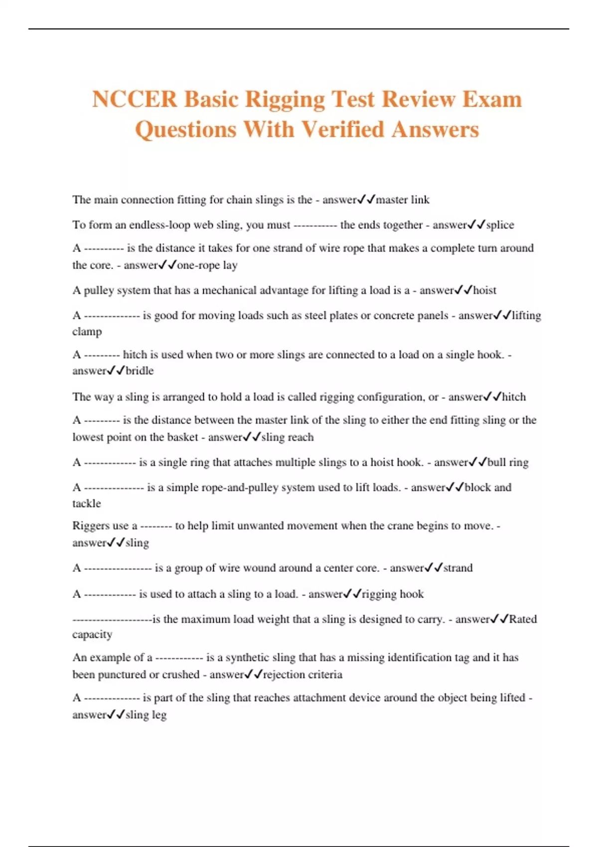 NCCER Basic Rigging Test Review Exam Questions With Verified Answers The main connection fitting for chain slings is the - answermaster link To form an endless-loop web sling, you must ----------- the ends together - answersplice A ---------- is the distance it takes for one strand of wire rope that makes a complete turn around the core. - answerone-rope lay A pulley system that has a mechanical advantage for lifting a load is a - answerhoist A -------------- is good for moving loads such as steel plates or concrete panels - answerlifting clamp A --------- hitch is used when two or more slings are connected to a load on a single hook. - answerbridle The way a sling is arranged to hold a load is called rigging configuration, or - answerhitch A --------- is the distance between the master link of the sling to either the end fitting sling or the lowest point on the basket - answersling reach