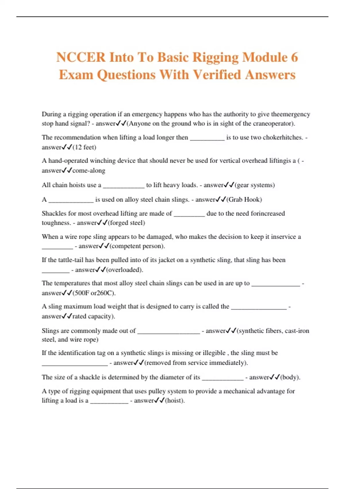 NCCER Into To Basic Rigging Module 6 Exam Questions With Verified Answers During a rigging operation if an emergency happens who has the authority to give theemergency stop hand signal? - answer(Anyone on the ground who is in sight of the craneoperator). The recommendation when lifting a load longer then __________ is to use two chokerhitches. - answer(12 feet) A hand-operated winching device that should never be used for vertical overhead liftingis a ( - answercome-along All chain hoists use a ____________ to lift heavy loads. - answer(gear systems) A _____________ is used on alloy steel chain slings. - answer(Grab Hook) Shackles for most overhead lifting are made of _________ due to the need forincreased toughness. - answer(forged steel) When a wire rope sling appears to be damaged, who makes the decision to keep it inservice a _________ - answer(competent person). If the tattle-tail has been pulled into of its jacket on a synthetic sling, that sling has been ________ - answer(overloaded). The temperatures that most alloy steel chain slings can be used in are up to ______________ - answer(500F or260C). A sling maximum load weight that is designed to carry is called the ________________ - answerrated capacity). Slings are commonly made out of __________________ - answer(synthetic fibers, cast-iron steel, and wire rope) If the identification tag on a synthetic slings is missing or illegible , the sling must be ___________________ - answer(removed from service immediately). The size of a shackle is determined by the diameter of its ____________ - answer(body). A type of rigging equipment that uses pulley system to provide a mechanical advantage for lifting a load is a ___________ - answer(hoist).