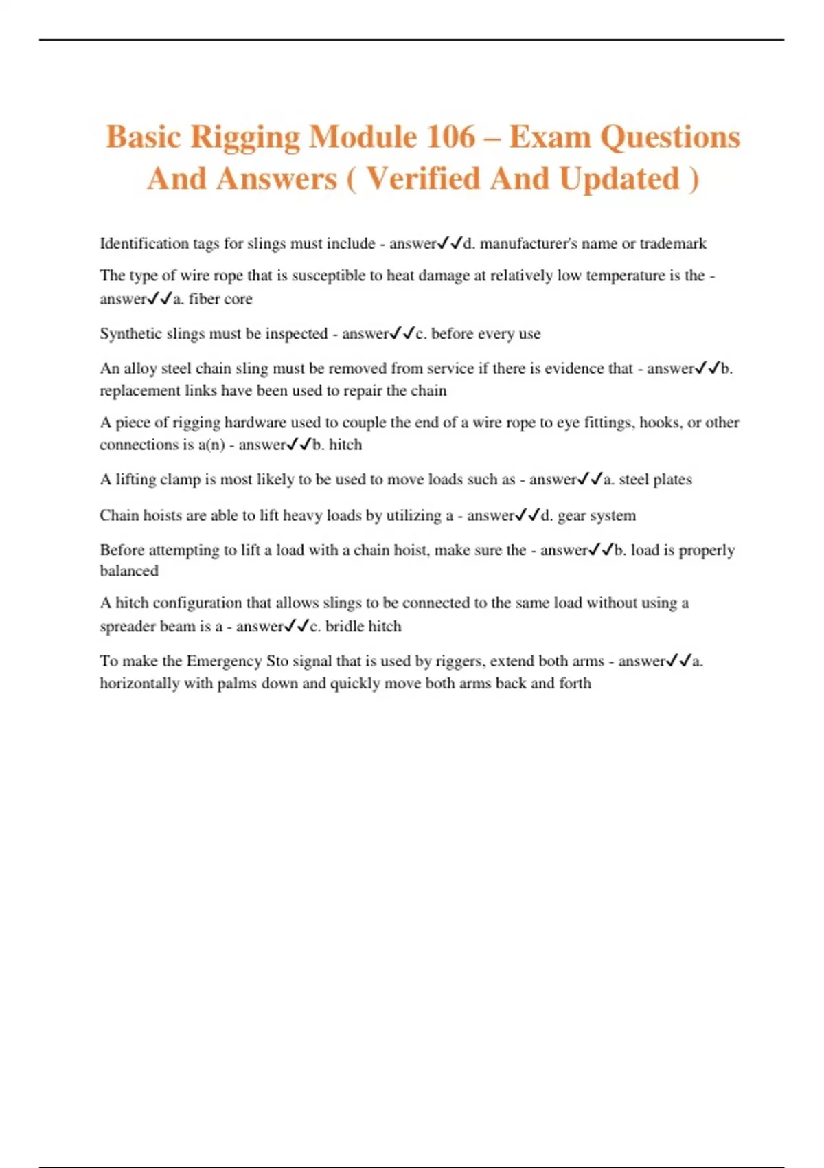 Basic Rigging Module 106 – Exam Questions And Answers ( Verified And Updated ) Identification tags for slings must include - answerd. manufacturer's name or trademark The type of wire rope that is susceptible to heat damage at relatively low temperature is the - answera. fiber core Synthetic slings must be inspected - answerc. before every use An alloy steel chain sling must be removed from service if there is evidence that - answerb. replacement links have been used to repair the chain A piece of rigging hardware used to couple the end of a wire rope to eye fittings, hooks, or other connections is a(n) - answerb. hitch