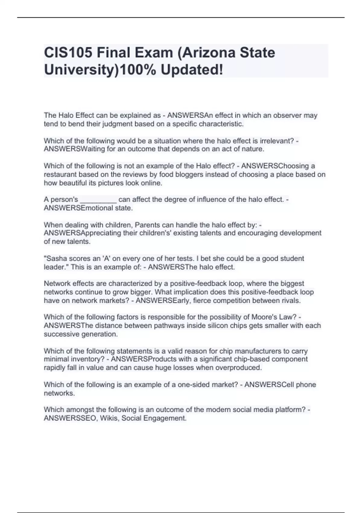 The Halo Effect can be explained as - ANSWERSAn effect in which an observer may tend to bend their judgment based on a specific characteristic. Which of the following would be a situation where the halo effect is irrelevant? - ANSWERSWaiting for an outcome that depends on an act of nature. Which of the following is not an example of the Halo effect? - ANSWERSChoosing a restaurant based on the reviews by food bloggers instead of choosing a place based on how beautiful its pictures look online. A person's _________ can affect the degree of influence of the halo effect. - ANSWERSEmotional state. When dealing with children, Parents can handle the halo effect by: - ANSWERSAppreciating their children's' existing talents and encouraging development of new talents. "Sasha scores an 'A' on every one of her tests. I bet she could be a good student leader." This is an example of: - ANSWERSThe halo effect. Network effects are characterized by a positive-feedback loop, where the biggest networks continue to grow bigger. What implication does this positive-feedback loop have on network markets? - ANSWERSEarly, fierce competition between rivals. Which of the following factors is responsible for the possibility of Moore's Law? - ANSWERSThe distance between pathways inside silicon chips gets smaller with each successive generation. Which of the following statements is a valid reason for chip manufacturers to carry minimal inventory? - ANSWERSProducts with a significant chip-based component rapidly fall in value and can cause huge losses when overproduced. Which of the following is an example of a one-sided market? - ANSWERSCell phone networks. Which amongst the following is an outcome of the modern social media platform? - ANSWERSSEO, Wikis, Social Engagement.