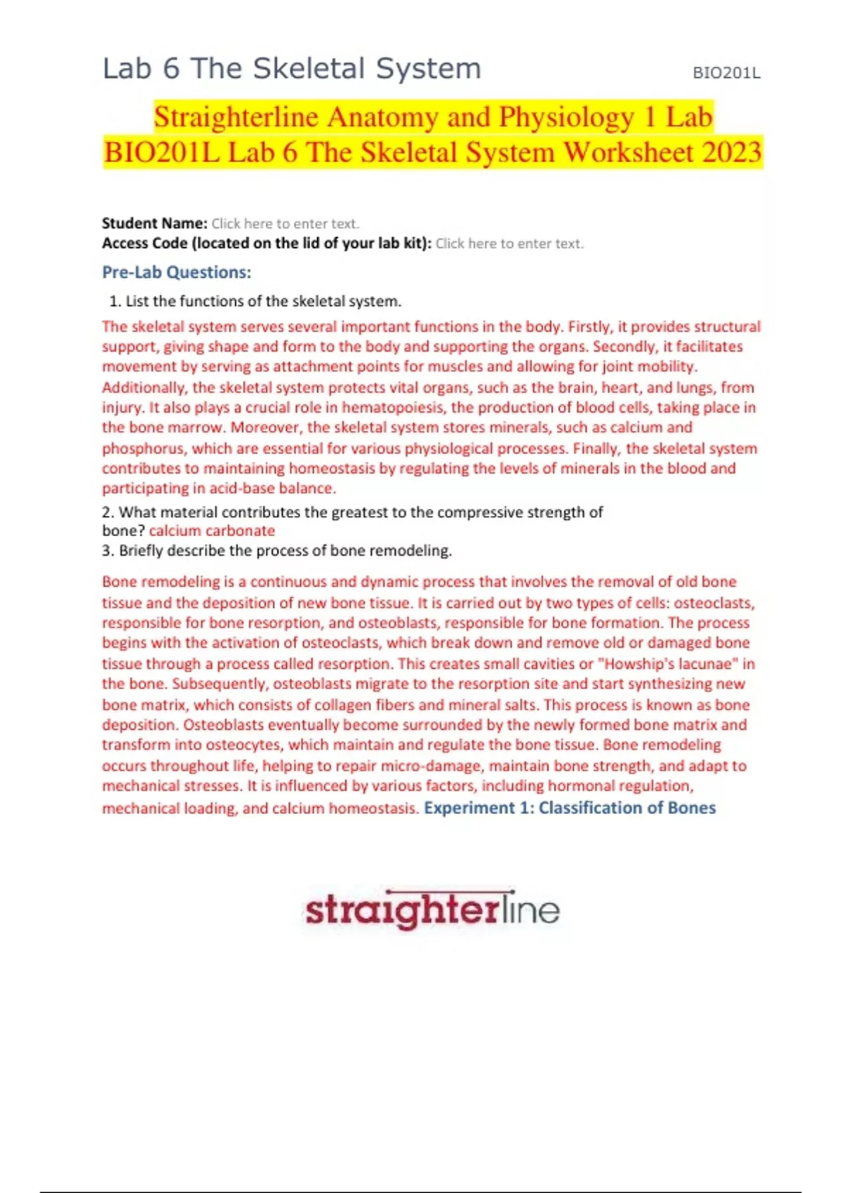 Straighterline Anatomy and Physiology 1 Lab BIO201L Lab 6 The Skeletal System Worksheet 2023