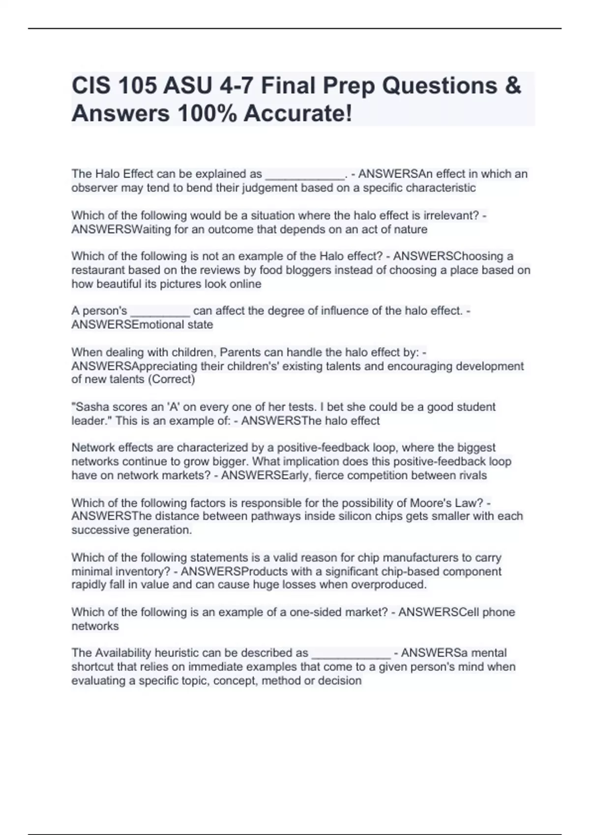 The Halo Effect can be explained as ____________. - ANSWERSAn effect in which an observer may tend to bend their judgement based on a specific characteristic Which of the following would be a situation where the halo effect is irrelevant? - ANSWERSWaiting for an outcome that depends on an act of nature Which of the following is not an example of the Halo effect? - ANSWERSChoosing a restaurant based on the reviews by food bloggers instead of choosing a place based on how beautiful its pictures look online A person's _________ can affect the degree of influence of the halo effect. - ANSWERSEmotional state When dealing with children, Parents can handle the halo effect by: - ANSWERSAppreciating their children's' existing talents and encouraging development of new talents (Correct) "Sasha scores an 'A' on every one of her tests. I bet she could be a good student leader." This is an example of: - ANSWERSThe halo effect Network effects are characterized by a positive-feedback loop, where the biggest networks continue to grow bigger. What implication does this positive-feedback loop have on network markets? - ANSWERSEarly, fierce competition between rivals Which of the following factors is responsible for the possibility of Moore's Law? - ANSWERSThe distance between pathways inside silicon chips gets smaller with each successive generation. Which of the following statements is a valid reason for chip manufacturers to carry minimal inventory? - ANSWERSProducts with a significant chip-based component rapidly fall in value and can cause huge losses when overproduced. Which of the following is an example of a one-sided market? - ANSWERSCell phone networks The Availability heuristic can be described as ____________ - ANSWERSa mental shortcut that relies on immediate examples that come to a given person's mind when evaluating a specific topic, concept, method or decision Which amongst the following is an outcome of the modern social media platform? - ANSWERSSEO, Wikis, Social Engagement