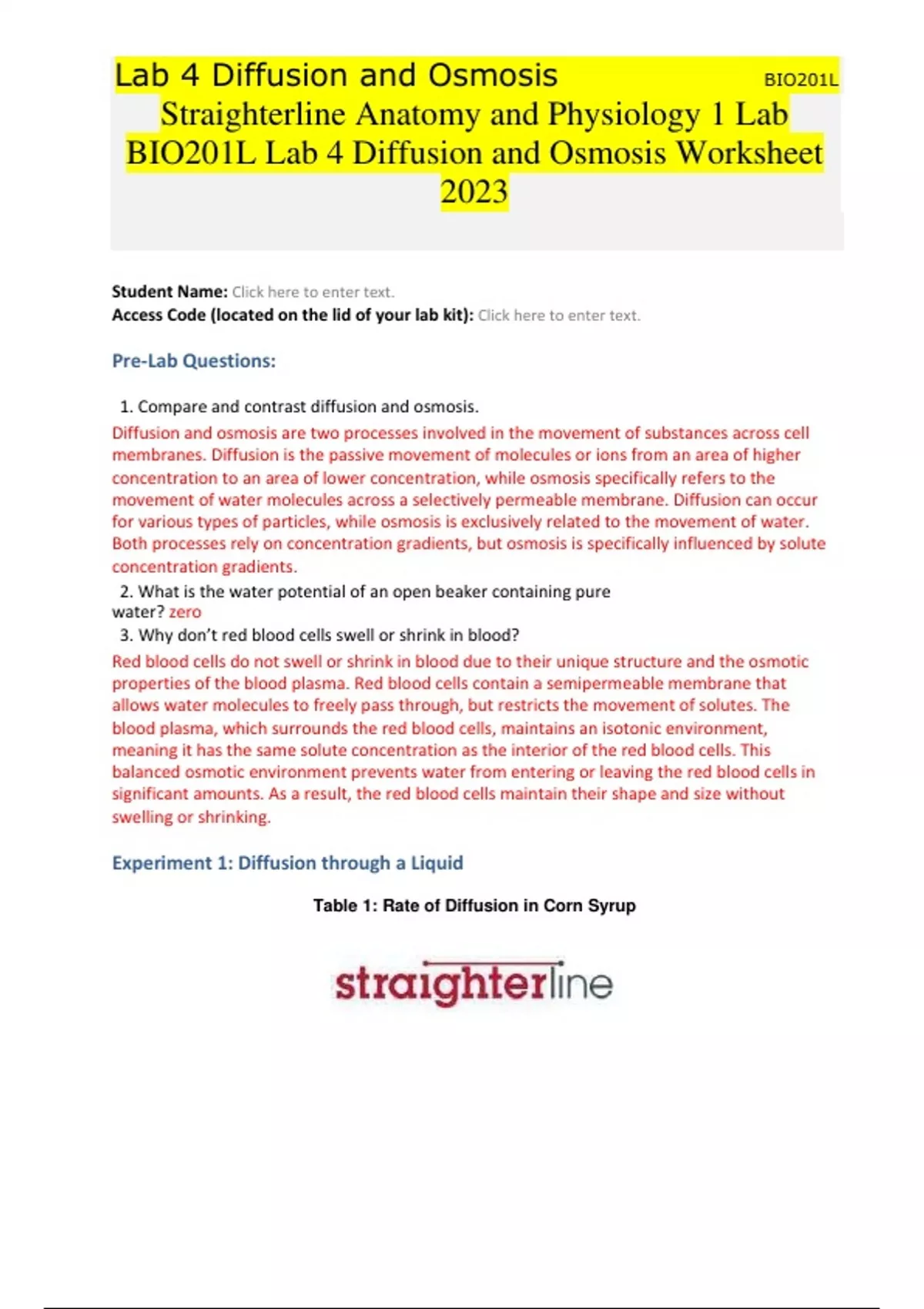 Straighterline Anatomy and Physiology 1 Lab BIO201L Lab 4 Diffusion and Osmosis Worksheet 2023