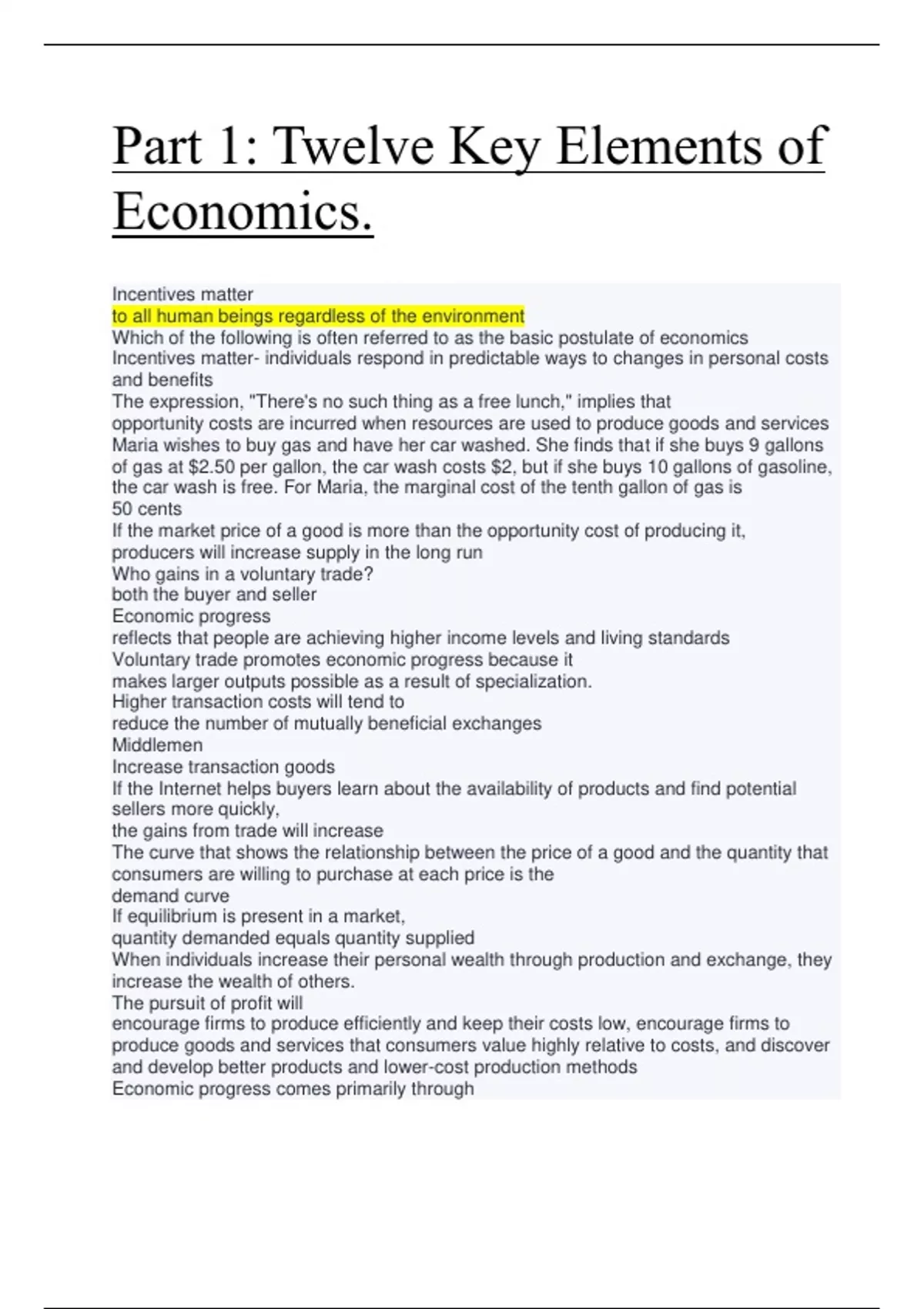 both the buyer and seller Economic progress reflects that people are achieving higher income levels and living standards Voluntary trade promotes economic progress because it makes larger outputs possible as a result of specialization. Higher transaction costs will tend to reduce the number of mutually beneficial exchanges Middlemen Increase transaction goods If the Internet helps buyers learn about the availability of products and find potential sellers more quickly, the gains from trade will increase The curve that shows the relationship between the price of a good and the quantity that consumers are willing to purchase at each price is the demand curve If equilibrium is present in a market, quantity demanded equals quantity supplied When individuals increase their personal wealth through production and exchange, they increase the wealth of others. The pursuit of profit will encourage firms to produce efficiently and keep their costs low, encourage firms to produce goods and services that consumers value highly relative to costs, and discover and develop better products and lower-cost production methods Economic progress comes primarily through