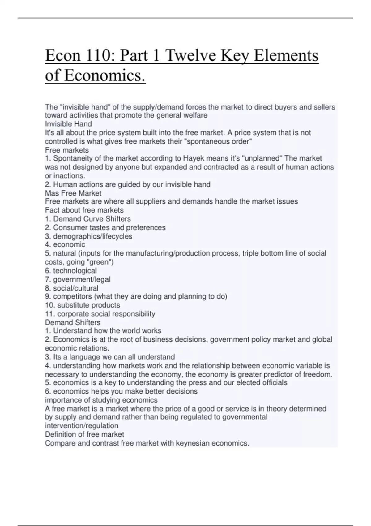 8. social/cultural 9. competitors (what they are doing and planning to do) 10. substitute products 11. corporate social responsibility Demand Shifters 1. Understand how the world works 2. Economics is at the root of business decisions, government policy market and global economic relations. 3. Its a language we can all understand 4. understanding how markets work and the relationship between economic variable is necessary to understanding the economy, the economy is greater predictor of freedom. 5. economics is a key to understanding the press and our elected officials 6. economics helps you make better decisions importance of studying economics A free market is a market where the price of a good or service is in theory determined by supply and demand rather than being regulated to governmental intervention/regulation Definition of free market Compare and contrast free market with keynesian economics.