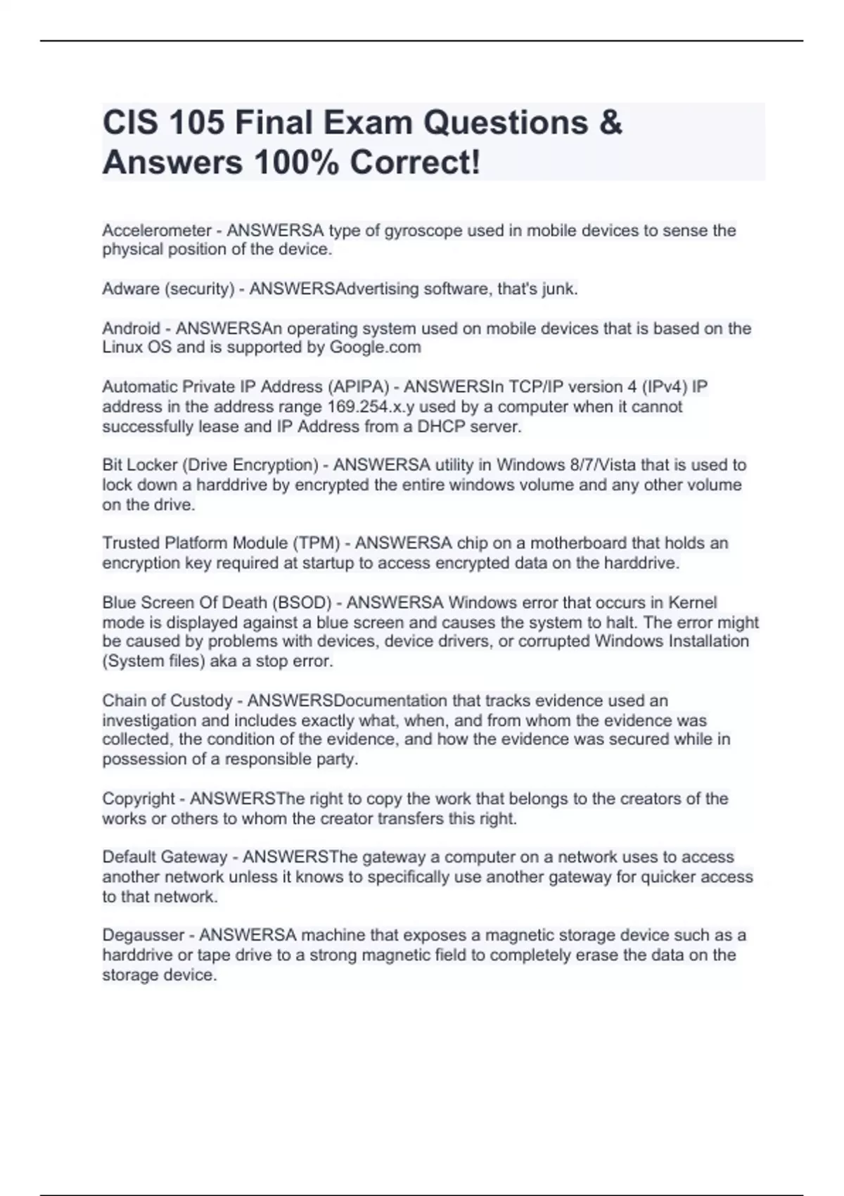 Accelerometer - ANSWERSA type of gyroscope used in mobile devices to sense the physical position of the device. Adware (security) - ANSWERSAdvertising software, that's junk. Android - ANSWERSAn operating system used on mobile devices that is based on the Linux OS and is supported by G Automatic Private IP Address (APIPA) - ANSWERSIn TCP/IP version 4 (IPv4) IP address in the address range 169.254.x.y used by a computer when it cannot successfully lease and IP Address from a DHCP server. Bit Locker (Drive Encryption) - ANSWERSA utility in Windows 8/7/Vista that is used to lock down a harddrive by encrypted the entire windows volume and any other volume on the drive. Trusted Platform Module (TPM) - ANSWERSA chip on a motherboard that holds an encryption key required at startup to access encrypted data on the harddrive. Blue Screen Of Death (BSOD) - ANSWERSA Windows error that occurs in Kernel mode is displayed against a blue screen and causes the system to halt. The error might be caused by problems with devices, device drivers, or corrupted Windows Installation (System files) aka a stop error. Chain of Custody - ANSWERSDocumentation that tracks evidence used an investigation and includes exactly what, when, and from whom the evidence was collected, the condition of the evidence, and how the evidence was secured while in possession of a responsible party. Copyright - ANSWERSThe right to copy the work that belongs to the creators of the works or others to whom the creator transfers this right. Default Gateway - ANSWERSThe gateway a computer on a network uses to access another network unless it knows to specifically use another gateway for quicker access to that network. Degausser - ANSWERSA machine that exposes a magnetic storage device such as a harddrive or tape drive to a strong magnetic field to completely erase the data on the storage device. Dynamic Host Configuration Protocol (DHCP) - ANSWERSA protocol used by a server