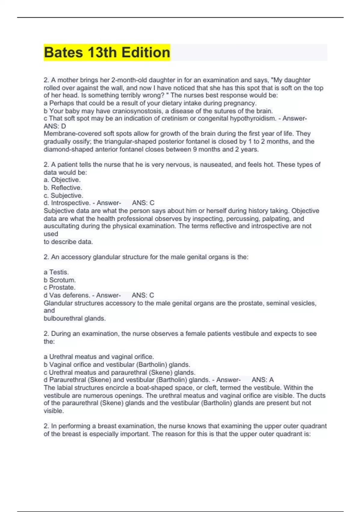 Bates 13th Edition 2. A mother brings her 2-month-old daughter in for an examination and says, "My daughter rolled over against the wall, and now I have noticed that she has this spot that is soft on the top of her head. Is something terribly wrong? " The nurses best response would be: a Perhaps that could be a result of your dietary intake during pregnancy. b Your baby may have craniosynostosis, a disease of the sutures of the brain. c That soft spot may be an indication of cretinism or congenital hypothyroidism. - Answer- ANS: D Membrane-covered soft spots allow for growth of the brain during the first year of life. They gradually ossify; the triangular-shaped posterior fontanel is closed by 1 to 2 months, and the diamond-shaped anterior fontanel closes between 9 months and 2 years. 2. A patient tells the nurse that he is very nervous, is nauseated, and feels hot. These types of data would be: a. Objective. b. Reflective. c. Subjective. d. Introspective. - Answer- ANS: C Subjective data are what the person says about him or herself during history taking. Objective data are what the health professional observes by inspecting, percussing, palpating, and auscultating during the physical examination. The terms reflective and introspective are not used to describe data. 2. An accessory glandular structure for the male genital organs is the: a Testis. b Scrotum. c Prostate. d Vas deferens. - Answer- ANS: C Glandular structures accessory to the male genital organs are the prostate, seminal vesicles, and bulbourethral glands. 2. During an examination, the nurse observes a female patients vestibule and expects to see the: a Urethral meatus and vaginal orifice. b Vaginal orifice and vestibular (Bartholin) glands. c Urethral meatus and paraurethral (Skene) glands. d Paraurethral (Skene) and vestibular (Bartholin) glands. - Answer- ANS: A The labial structures encircle a boat-shaped space, or cleft, termed the vestibule. Within the vestibule are numerous openings. The urethral meatus and vaginal orifice are visible. The ducts of the paraurethral (Skene) glands and the vestibular (Bartholin) glands are present but not visible. 2. In performing a breast examination, the nurse knows that examining the upper outer quadrant of the breast is especially important. The reason for this is that the upper ou