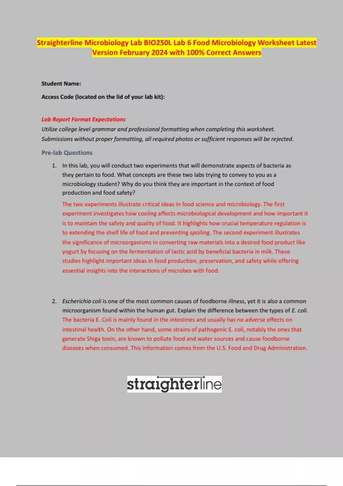Straighterline Microbiology Lab BIO250L Lab 6 Food Microbiology Worksheet Latest Version February 2024 with 100% Correct Answers