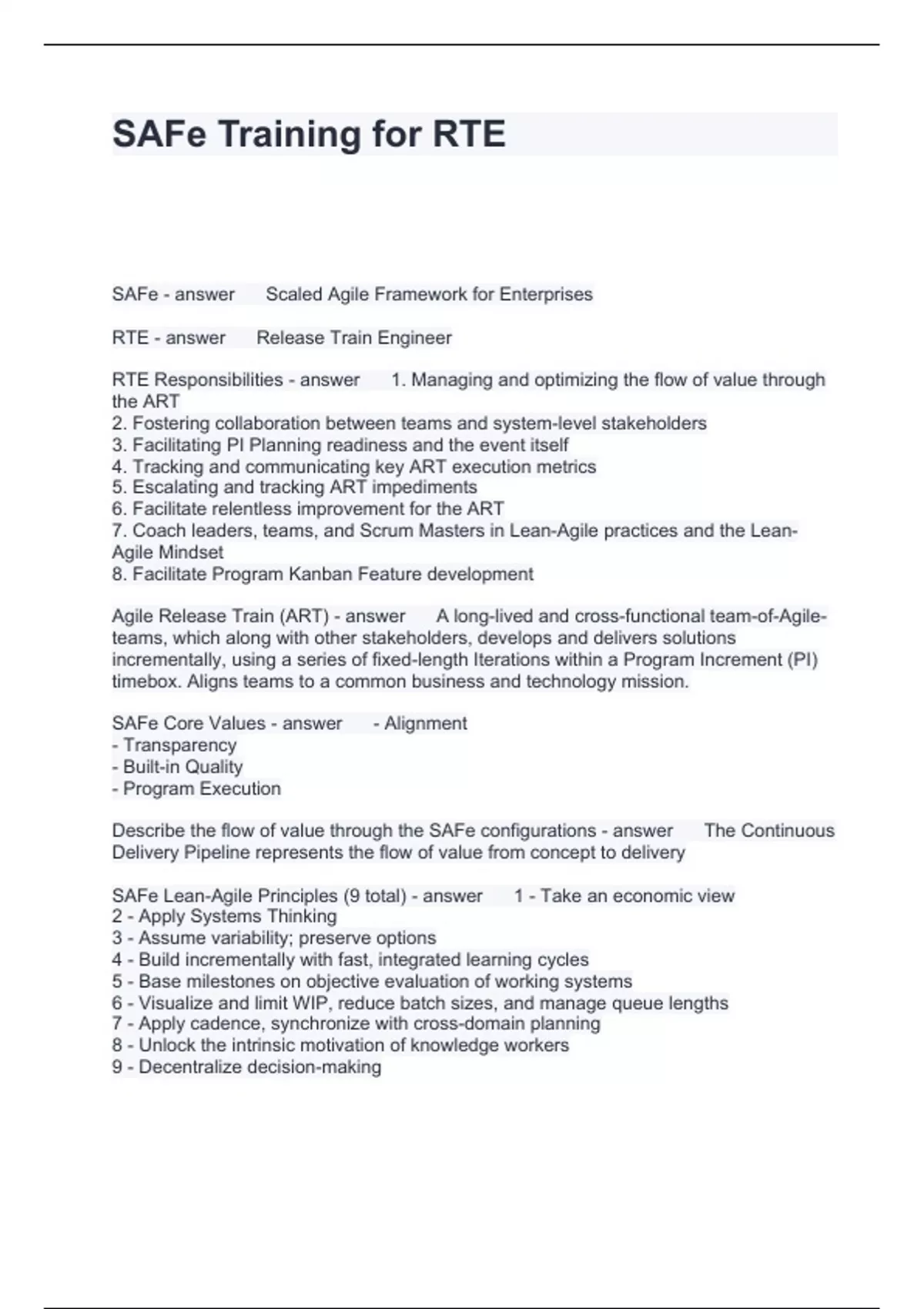 SAFe Training for RTE Questions and Answers 100% correct