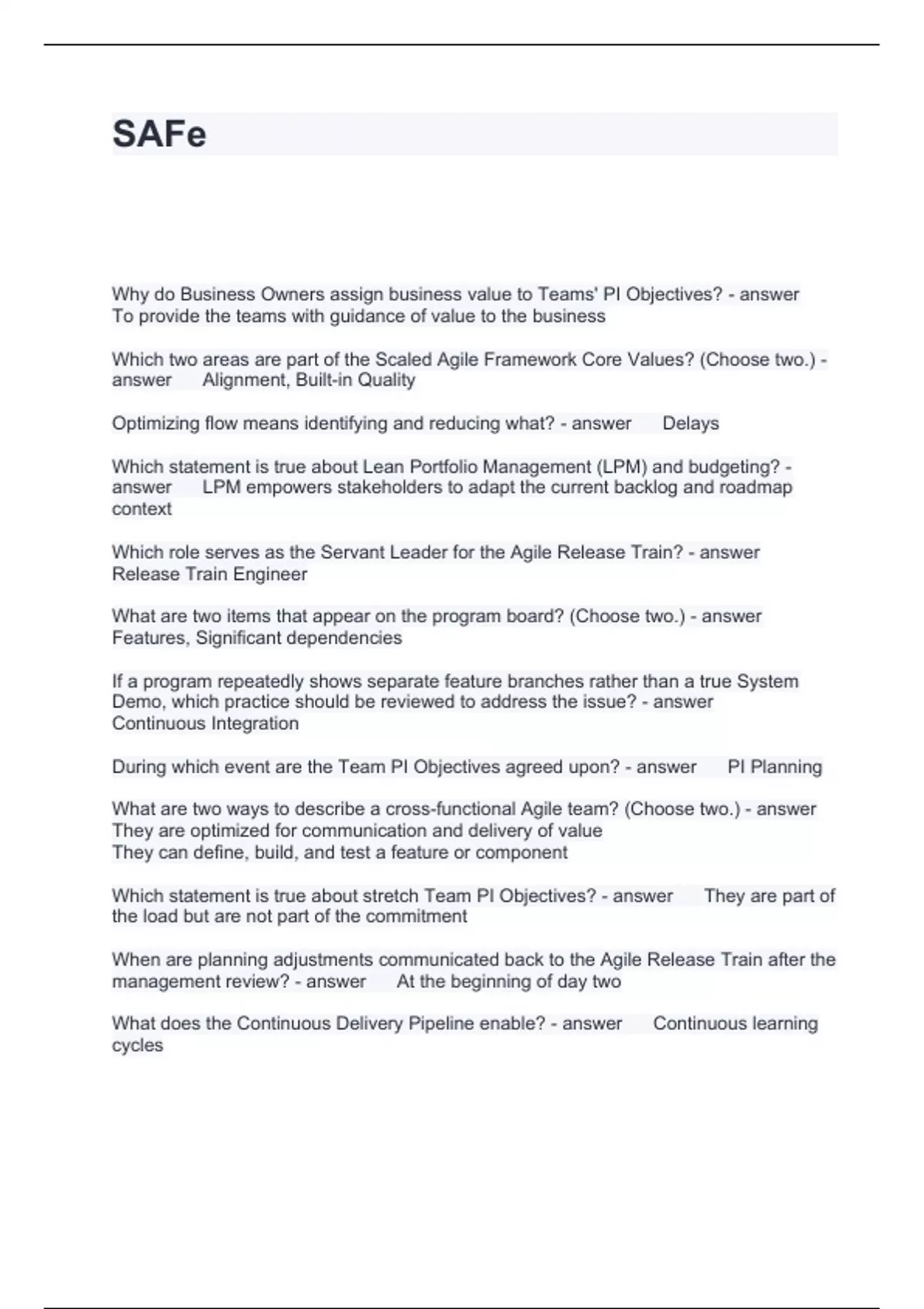SAFe Questions and Answers 100% Correct