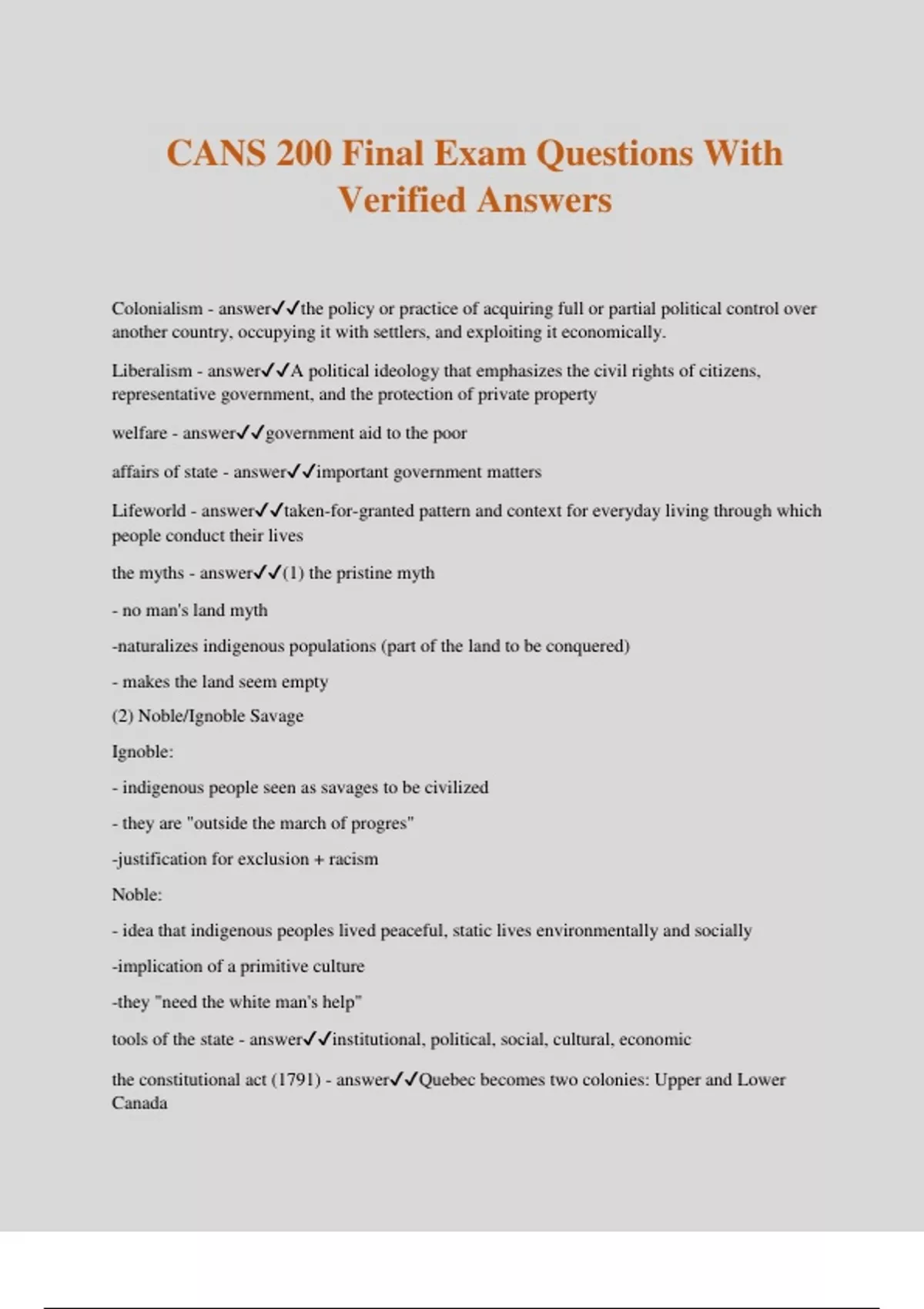 CANS 200 Final Exam Questions With Verified Answers Colonialism - answerthe policy or practice of acquiring full or partial political control over another country, occupying it with settlers, and exploiting it economically. Liberalism - answerA political ideology that emphasizes the civil rights of citizens, representative government, and the protection of private property welfare - answergovernment aid to the poor affairs of state - answerimportant government matters Lifeworld - answertaken-for-granted pattern and context for everyday living through which people conduct their lives the myths - answer(1) the pristine myth - no man's land myth -naturalizes indigenous populations (part of the land to be conquered) - makes the land seem empty (2) Noble/Ignoble Savage Ignoble: - indigenous people seen as savages to be civilized - they are "outside the march of progres" -justification for exclusion + racism Noble: - idea that indigenous peoples lived peaceful, static lives environmentally and socially -implication of a primitive culture -they "need the white man's help" tools of the state - answerinstitutional, political, social, cultural, economic the constitutional act (1791) - answerQuebec becomes two colonies: Upper and Lower Canada