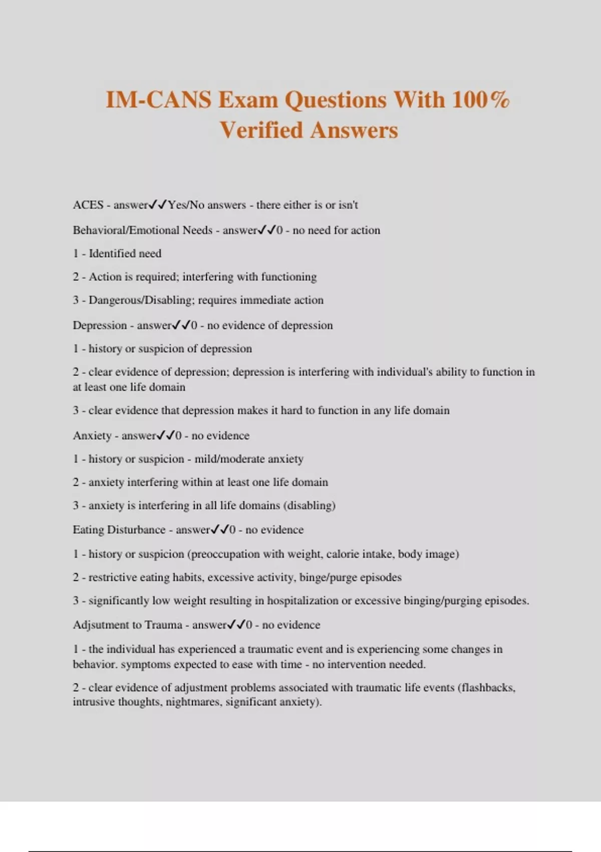 IM-CANS Exam Questions With 100% Verified Answers ACES - answerYes/No answers - there either is or isn't Behavioral/Emotional Needs - answer0 - no need for action 1 - Identified need 2 - Action is required; interfering with functioning 3 - Dangerous/Disabling; requires immediate action Depression - answer0 - no evidence of depression 1 - history or suspicion of depression 2 - clear evidence of depression; depression is interfering with individual's ability to function in at least one life domain 3 - clear evidence that depression makes it hard to function in any life domain Anxiety - answer0 - no evidence 1 - history or suspicion - mild/moderate anxiety 2 - anxiety interfering within at least one life domain 3 - anxiety is interfering in all life domains (disabling) Eating Disturbance - answer0 - no evidence 1 - history or suspicion (preoccupation with weight, calorie intake, body image) 2 - restrictive eating habits, excessive activity, binge/purge episodes 3 - significantly low weight resulting in hospitalization or excessive binging/purging episodes. Adjsutment to Trauma - answer0 - no evidence 1 - the individual has experienced a traumatic event and is experiencing some changes in behavior. symptoms expected to ease with time - no intervention needed. 2 - clear evidence of adjustment problems associated with traumatic life events (flashbacks, intrusive thoughts, nightmares, significant anxiety).