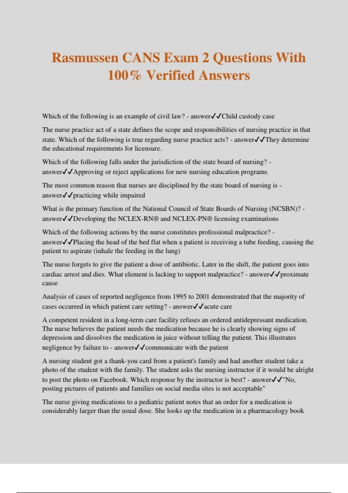 Rasmussen CANS Exam 2 Questions With 100% Verified Answers Which of the following is an example of civil law? - answerChild custody case The nurse practice act of a state defines the scope and responsibilities of nursing practice in that state. Which of the following is true regarding nurse practice acts? - answerThey determine the educational requirements for licensure. Which of the following falls under the jurisdiction of the state board of nursing? - answerApproving or reject applications for new nursing education programs The most common reason that nurses are disciplined by the state board of nursing is - answerpracticing while impaired What is the primary function of the National Council of State Boards of Nursing (NCSBN)? - answerDeveloping the NCLEX-RN® and NCLEX-PN® licensing examinations Which of the following actions by the nurse constitutes professional malpractice? - answerPlacing the head of the bed flat when a patient is receiving a tube feeding, causing the patient to aspirate (inhale the feeding in the lung) The nurse forgets to give the patient a dose of antibiotic. Later in the shift, the patient goes into cardiac arrest and dies. What element is lacking to support malpractice? - answerproximate cause Analysis of cases of reported negligence from 1995 to 2001 demonstrated that the majority of cases occurred in which patient care setting? - answeracute care A competent resident in a long-term care facility refuses an ordered antidepressant medication. The nurse believes the patient needs the medication because he is clearly showing signs of depression and dissolves the medication in juice without telling the patient. This illustrates negligence by failure to - answercommunicate with the patient A nursing student got a thank-you card from a patient's family and had another student take a photo of the student with the family. The student asks the nursing instructor if it would be alright to post the photo on Facebook. Which response by the instructor is best? - answer"No, posting pictures of patients and families on social media sites is not acceptable" The nurse giving medications to a pediatric patient notes that an order for a medication is considerably larger than the usual dose. She looks up the medication in a pharmacology book and finds she is correct about the dosage. Which action should the nurse take? - answerNotifying the physician of her findings before giving the medication Which of the following nursing responsibilities can never be delegated? - answeraccountability The RN asked a nursing assistant to monitor several postoperative patients. Which of the following instructions to the nursing assistant demonstrate appropriate delegation? - answer"Record the urine output, and report to me if they have not voided within 4 hours." The RN delegates changing a sterile dressing over a central line to a licensed practical/vocational nurse (LPN/LVN). The LPN/LVN contaminated the site during the dressing change, and an infection developed in the patient. Which of the following statements is true? - answerThe RN is ultimately responsible for acts he or she delegates. Which of the following is a legitimate defense to a charge of assault and battery? - answerinformed consent In which of the following situations should the legality of an informed consent be questioned? - answerPatient who received a preoperative dose of Demerol before giving consent Which of the following is a nursing responsibility regarding informed consent? - answerServing as a witness, ensuring that the patient does not feel coerced into a decision Which of the following actions is acceptable as an exception to a nurse's obligation regarding confidentiality? - answerReporting certain diseases to public health authority Which patient rights are guaranteed by HIPAA? - answerPatients are protected against medical records being indiscriminately shared. A child is tested for genetic abnormalities. After the test results are delivered from the laboratory, a representative of the parents' medical insurance company calls the nurse's station and asks for the results of the tests. The nurse's best response to this request is to - answerrefuse to give the information The Patient Self-Determination Act of 1991, as implemented today, is known as providing - answeradvance directives Which of the following puts the nurse at increased risk for legal action? - answerNot assessing a patient who is complaining of pain Which of the following chart entries represents a pitfall in documentation? - answerPatient demanding and difficult to please The quality of nursing care is judged by whether nursing actions meet the standard of care. Which of the following is an example of meeting the standard of care? - answerDemonstrating the use of the nursing process when charting