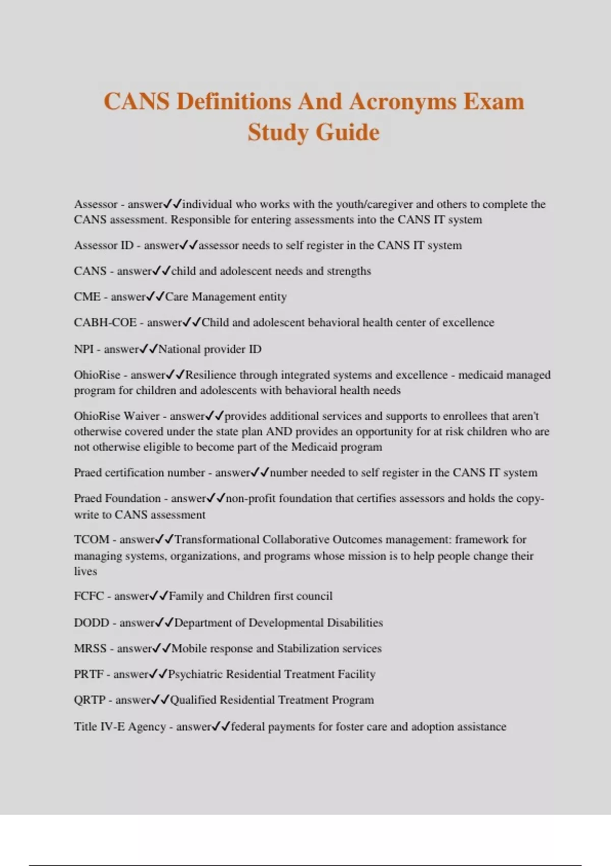 CANS Definitions And Acronyms Exam Study Guide Assessor - answerindividual who works with the youth/caregiver and others to complete the CANS assessment. Responsible for entering assessments into the CANS IT system Assessor ID - answerassessor needs to self register in the CANS IT system CANS - answerchild and adolescent needs and strengths CME - answerCare Management entity CABH-COE - answerChild and adolescent behavioral health center of excellence NPI - answerNational provider ID OhioRise - answerResilience through integrated systems and excellence - medicaid managed program for children and adolescents with behavioral health needs OhioRise Waiver - answerprovides additional services and supports to enrollees that aren't otherwise covered under the state plan AND provides an opportunity for at risk children who are not otherwise eligible to become part of the Medicaid program Praed certification number - answernumber needed to self register in the CANS IT system Praed Foundation - answernon-profit foundation that certifies assessors and holds the copy- write to CANS assessment TCOM - answerTransformational Collaborative Outcomes management: framework for managing systems, organizations, and programs w