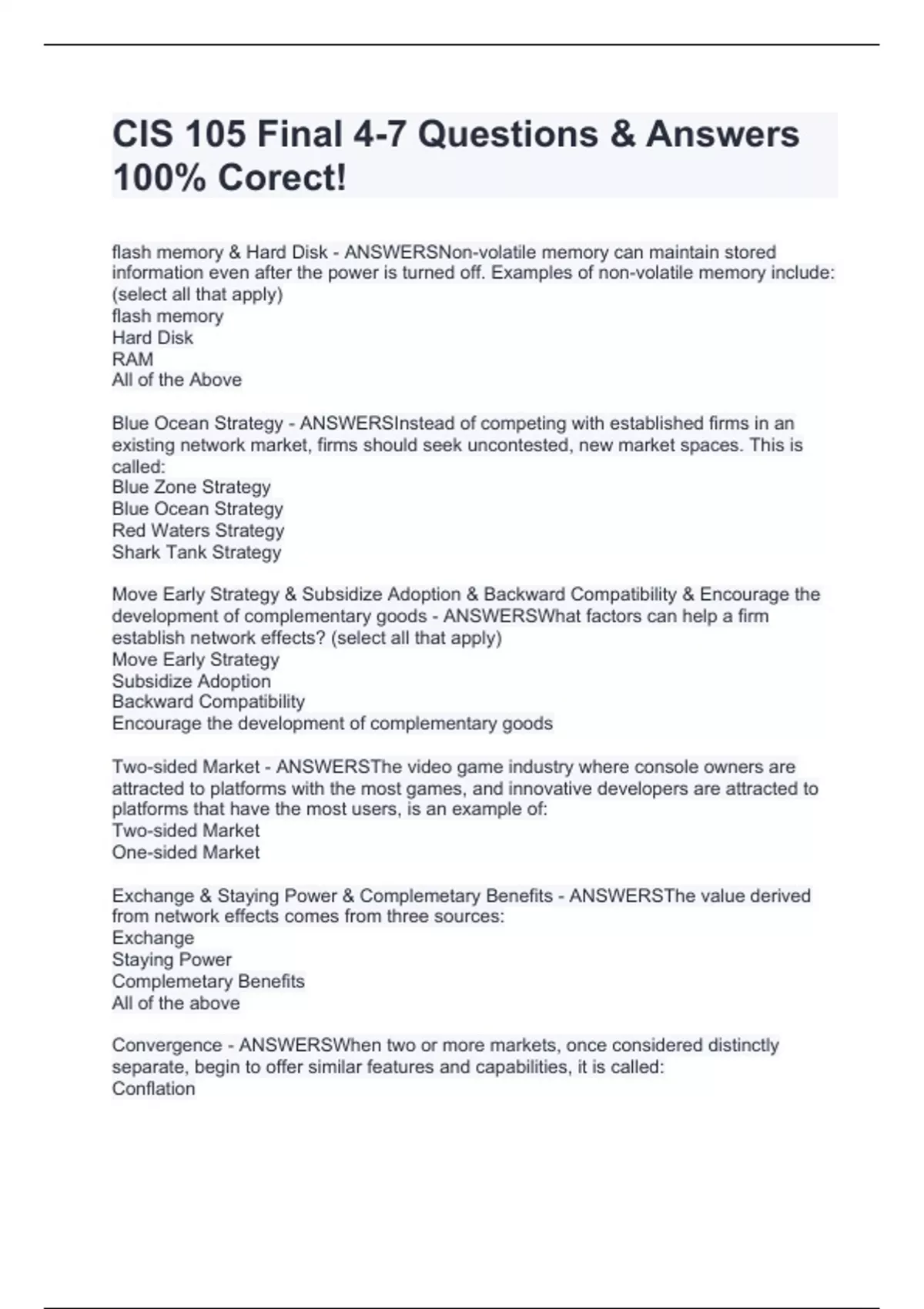 flash memory & Hard Disk - ANSWERSNon-volatile memory can maintain stored information even after the power is turned off. Examples of non-volatile memory include: (select all that apply) flash memory Hard Disk RAM All of the Above Blue Ocean Strategy - ANSWERSInstead of competing with established firms in an existing network market, firms should seek uncontested, new market spaces. This is called: Blue Zone Strategy Blue Ocean Strategy Red Waters Strategy Shark Tank Strategy Move Early Strategy & Subsidize Adoption & Backward Compatibility & Encourage the development of complementary goods - ANSWERSWhat factors can help a firm establish network effects? (select all that apply) Move Early Strategy Subsidize Adoption Backward Compatibility Encourage the development of complementary goods Two-sided Market - ANSWERSThe video game industry where console owners are attracted to platforms with the most games, and innovative developers are attracted to platforms that have the most users, is an example of: Two-sided Market One-sided Market Exchange & Staying Power & Complemetary Benefits - ANSWERSThe value derived from network effects comes from three sources: Exchange Staying Power Complemetary Benefits All of the above Convergence - ANSWERSWhen two or more markets, once considered distinctly separate, begin to offer similar features and capabilities, it is called: C