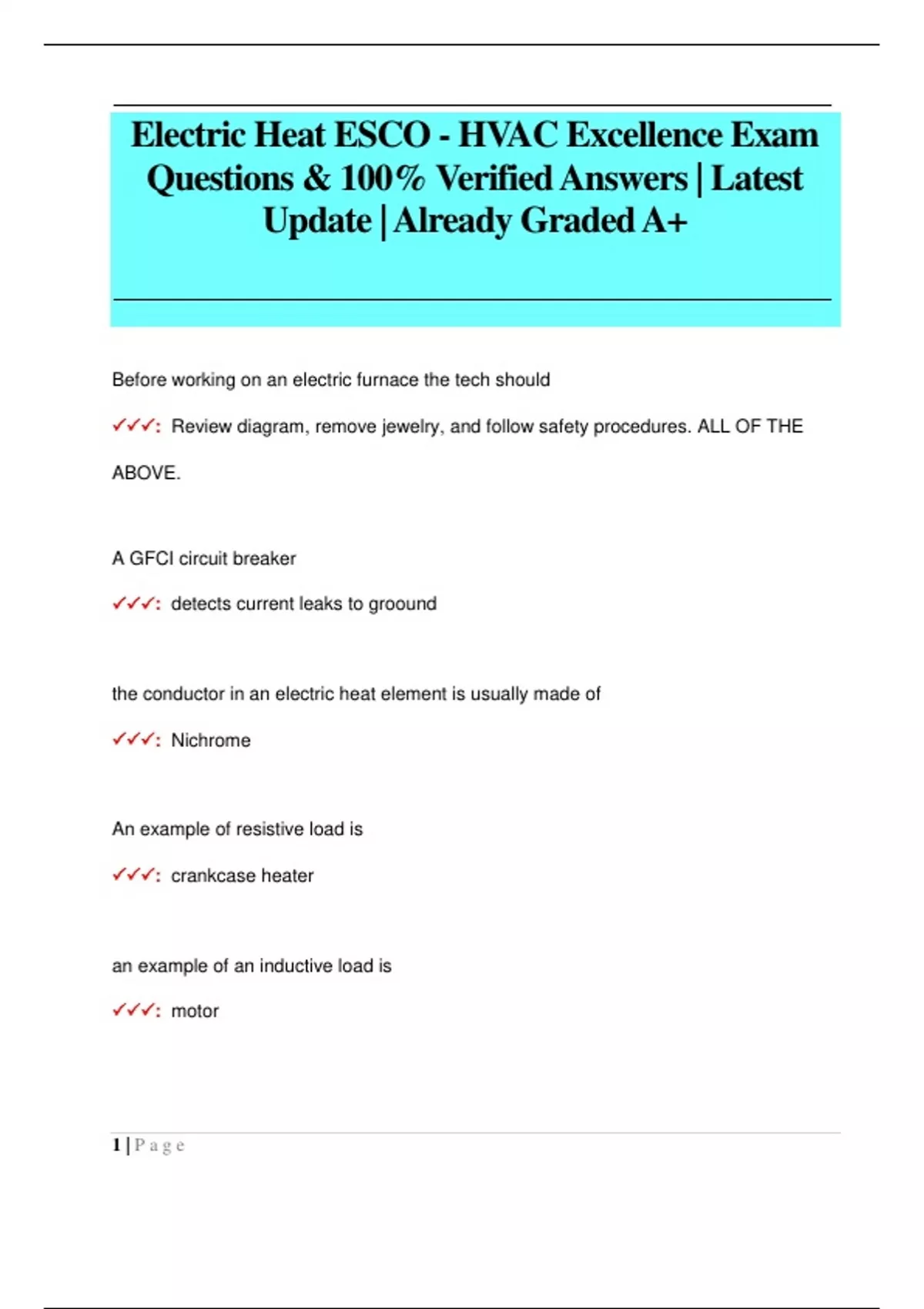 Electric Heat ESCO - HVAC Excellence Exam Questions & 100% Verified Answers | Latest Update | Already Graded A+