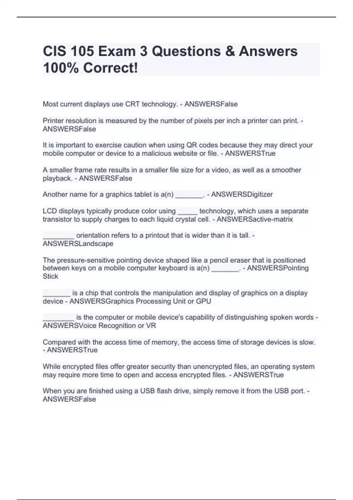 Most current displays use CRT technology. - ANSWERSFalse Printer resolution is measured by the number of pixels per inch a printer can print. - ANSWERSFalse It is important to exercise caution when using QR codes because they may direct your mobile computer or device to a malicious website or file. - ANSWERSTrue A smaller frame rate results in a smaller file size for a video, as well as a smoother playback. - ANSWERSFalse Another name for a graphics tablet is a(n) _______. - ANSWERSDigitizer LCD displays typically produce color using _____ technology, which uses a separate transistor to supply charges to each liquid crystal cell. - ANSWERSactive-matrix ________ orientation refers to a printout that is wider than it is tall. - ANSWERSLandscape The pressure-sensitive pointing device shaped like a pencil eraser that is positioned between keys on a mobile computer keyboard is a(n) _______. - ANSWERSPointing Stick _______ is a chip that controls the manipulation and display of graphics on a display device - ANSWERSGraphics Processing Unit or GPU ________ is the computer or mobile device's capability of distinguishing spoken words - ANSWERSVoice Recognition or VR Compared with the access time of memory, the access time of storage devices is slow. - ANSWERSTrue While encrypted files offer greater security than unencrypted files, an operating system may require more time to open and access encrypted files. - ANSWERSTrue When you are finished using a USB flash drive, simply remove it from the USB port. - ANSWERSFalse The process of copying audio and/or video data from a purchased disc and saving it on your own media is called ____. - ANSWERSRipping