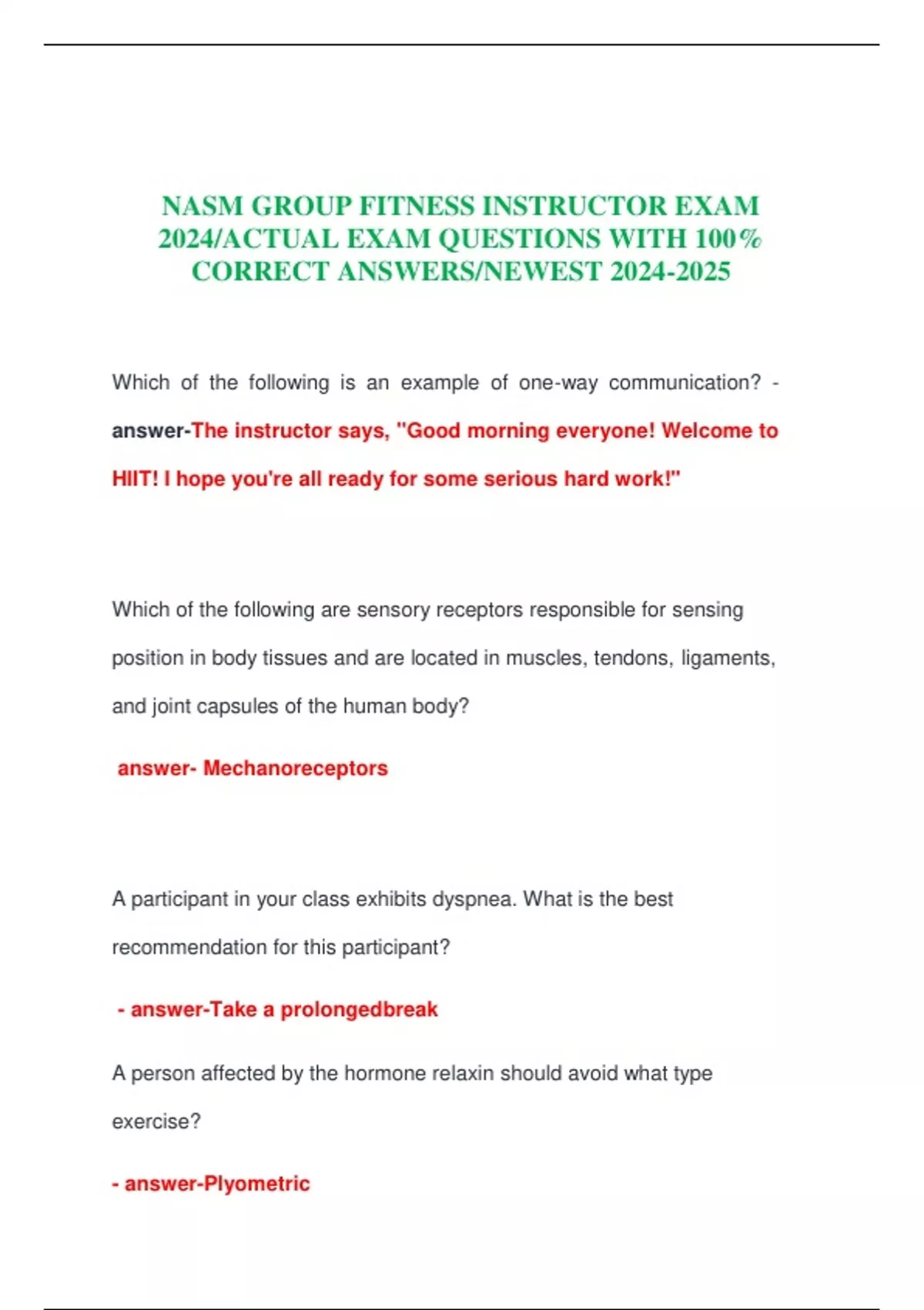NASM GROUP FITNESS INSTRUCTOR EXAM 2024/ACTUAL EXAM QUESTIONS WITH 100% CORRECT ANSWERS/NEWEST
