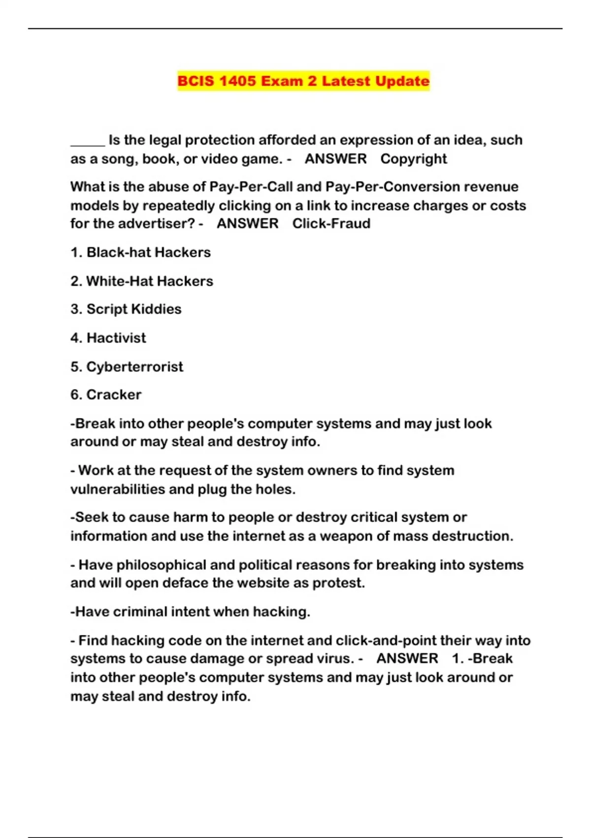 BCIS 1405 Exam 2 Latest Update...