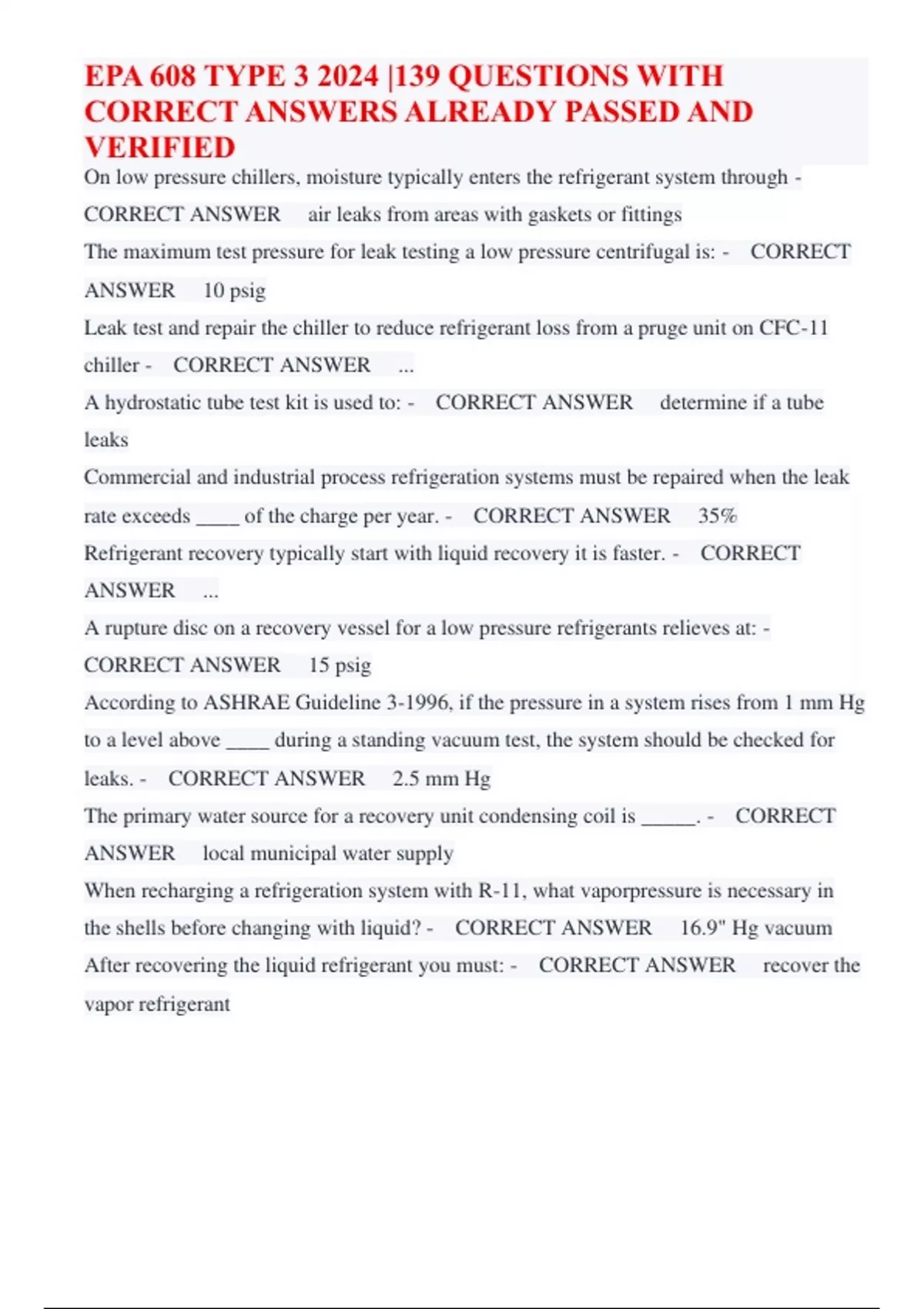 EPA 608 TYPE 3 2024 |139 QUESTIONS WITH CORRECT ANSWERS ALREADY PASSED AND VERIFIED On low pressure chillers, moisture typically enters the refrigerant system through - CORRECT ANSWER air leaks from areas with gaskets or fittings The maximum test pressure for leak testing a low pressure centrifugal is: - CORRECT ANSWER 10 psig Leak test and repair the chiller to reduce refrigerant loss from a pruge unit on CFC-11 chiller - CORRECT ANSWER ... A hydrostatic tube test kit is used to: - CORRECT ANSWER determine if a tube leaks Commercial and industrial process refrigeration systems must be repaired when the leak rate exceeds ____ of the charge per year. - CORRECT ANSWER 35% Refrigerant recovery typically start with liquid recovery it is faster. - CORRECT ANSWER ... A rupture disc on a recovery vessel for a low pressure refrigerants relieves at: - CORRECT ANSWER 15 psig According to ASHRAE Guideline 3-1996, if the pressure in a system rises from 1 mm Hg to a level above ____ during a standing vacuum test, the system should be checked for leaks. - CORRECT ANSWER 2.5 mm Hg The primary water source for a recovery unit condensing coil is _____. - CORRECT ANSWER local municipal water supply When recharging a refrigeration system with R-11, what vaporpressure is necessary in the shells before changing with liquid? - CORRECT ANSWER 16.9" Hg vacuum After recovering the liquid refrigerant you must: - CORRECT ANSWER recover the vapor refrigerant