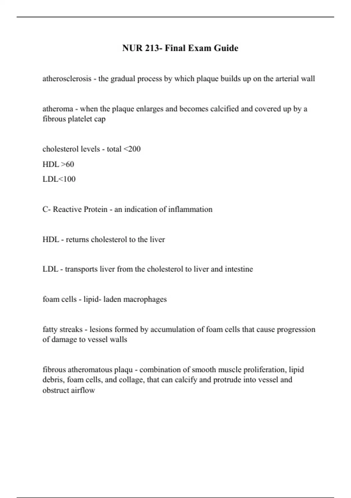 atherosclerosis - the gradual process by which plaque builds up on the arterial wall atheroma - when the plaque enlarges and becomes calcified and covered up by a fibrous platelet cap cholesterol levels - total <200 HDL >60 LDL<100 C- Reactive Protein - an indication of inflammation HDL - returns cholesterol to the liver LDL - transports liver from the cholesterol to liver and intestine foam cells - lipid- laden macrophages fatty streaks - lesions formed by accumulation of foam cells that cause progression of damage to vessel walls fibrous atheromatous plaqu - combination of smooth muscle proliferation, lipid debris, foam cells, and collage, that can calcify and protrude into vessel and obstruct airflowhypothyroidism - insufficient levels of thyroid hormones T3 and T4, high TSH levels; Hashimotos autoimmune disease most common cause hyperthyroidism - excess secretion of T3 and T4, low levels of TSH; Graves disease most common cause type 1 diabetes - autoimmune destruction of beta cells leading to absolute insulin deficiency; requires insulin replacement type 2 diabetes - cellular resistance to insulin ketoacidosis - ketone accumulation in the bloodstream; sign of diabetes type 1; ketonemia and ketonuria hypoglycemia - excess insulin in the blood leading to low glucose levels; insulin shock; need immediate replacement of glucose metabolic syndrome - group of disorders that together confer a high risk of diabetes type 2; obesity, dyslipidemia, prehypertension, elevated FBS leukocytosis - too many WBC cells leukopenia - too few WBCs erythroblasts - immature RBCs megakaryoblasts - immature thrombocytesmyeloblasts - immature basophils, esinophils, and neutrophils monoblasts - immature monocytes lymphoblasts - immature B and T lymphocytes leukemias - uncontrolled proliferation of malignant leukocytes causing an overcrowding of bone marrow and decreased production and function of normal hematopoietic cells acute leukemias - undifferentiated or immature cells ( blast cells) chronic leukemias - predominant cell is mature but does not function normally chronic lymphocytic leukemia - most common; b lymphocyte malignancy acute myelogenous leukemia - caused by proliferation of myeloid cells in the bone marrow hodgkin lymphoma - characterized by the presence of Reed- Sternberg cells in lymph nodes