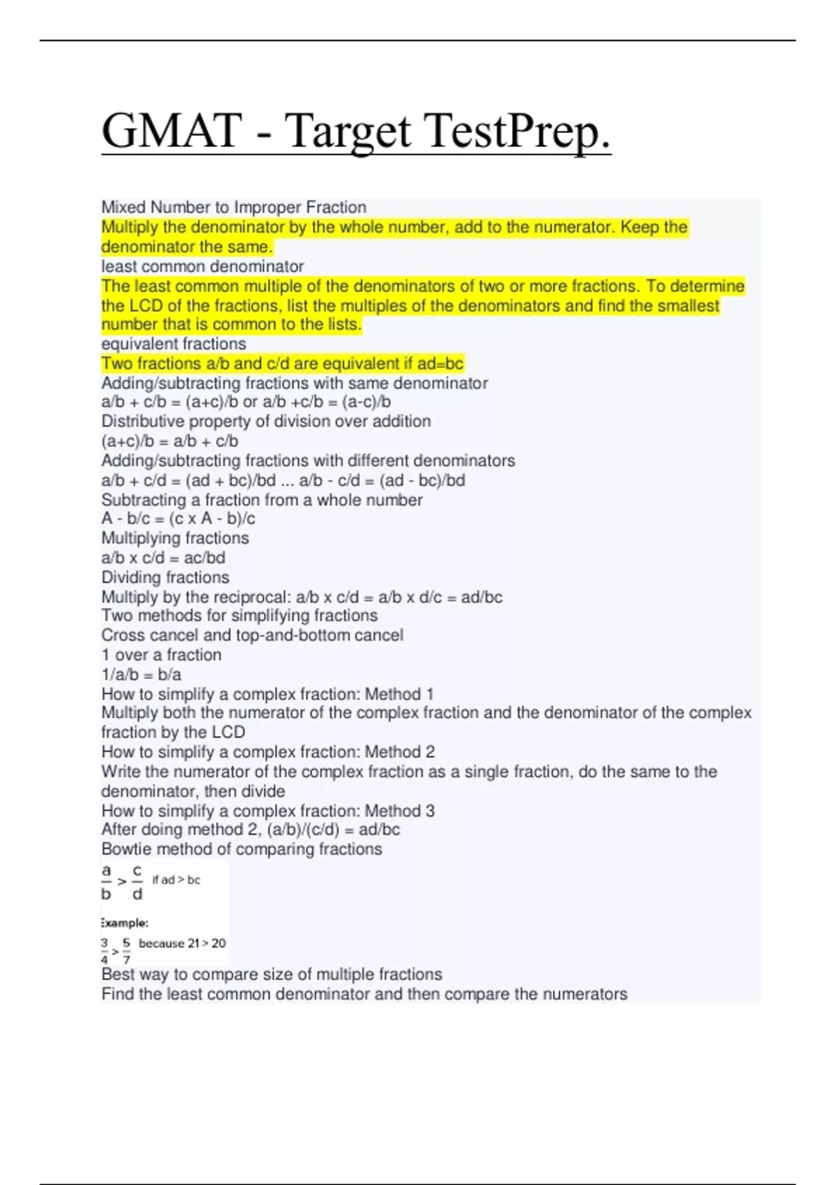 a/b x c/d = ac/bd Dividing fractions Multiply by the reciprocal: a/b x c/d = a/b x d/c = ad/bc Two methods for simplifying fractions Cross cancel and top-and-bottom cancel 1 over a fraction 1/a/b = b/a How to simplify a complex fraction: Method 1 Multiply both the numerator of the complex fraction and the denominator of the complex fraction by the LCD How to simplify a complex fraction: Method 2 Write the numerator of the complex fraction as a single fraction, do the same to the denominator, then divide How to simplify a complex fraction: Method 3 After doing method 2, (a/b)/(c/d) = ad/bc Bowtie method of comparing fractions Best way to compare size of multiple fractions Find the least common denominator and then compare the numerators