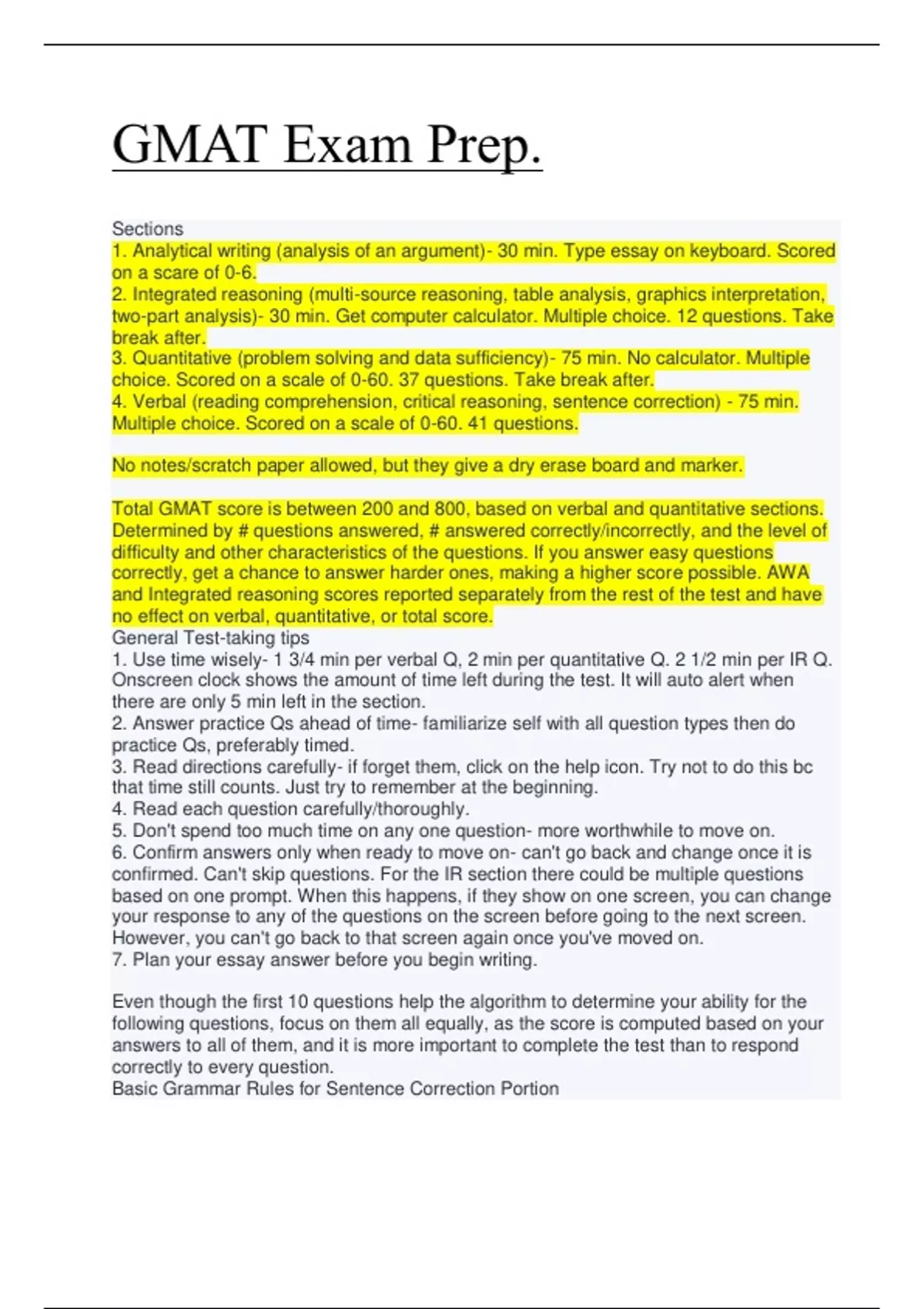 General Test-taking tips 1. Use time wisely- 1 3/4 min per verbal Q, 2 min per quantitative Q. 2 1/2 min per IR Q. Onscreen clock shows the amount of time left during the test. It will auto alert when there are only 5 min left in the section. 2. Answer practice Qs ahead of time- familiarize self with all question types then do practice Qs, preferably timed. 3. Read directions carefully- if forget them, click on the help icon. Try not to do this bc that time still counts. Just try to remember at the beginning. 4. Read each question carefully/thoroughly. 5. Don't spend too much time on any one question- more worthwhile to move on. 6. Confirm answers only when ready to move on- can't go back and change once it is confirmed. Can't skip questions. For the IR section there could be multiple questions based on one prompt. When this happens, if they show on one screen, you can change your response to any of the questions on the screen before going to the next screen. However, you can't go back to that screen again once you've moved on. 7. Plan your essay answer before you begin writing. Even though the first 10 questions help the algorithm to determine your ability for the following questions, focus on them all equally, as the score is computed based on your answers to all of them, and it is more important to complete the test than to respond correctly to every question. Basic Grammar Rules for Sentence Correction Portion