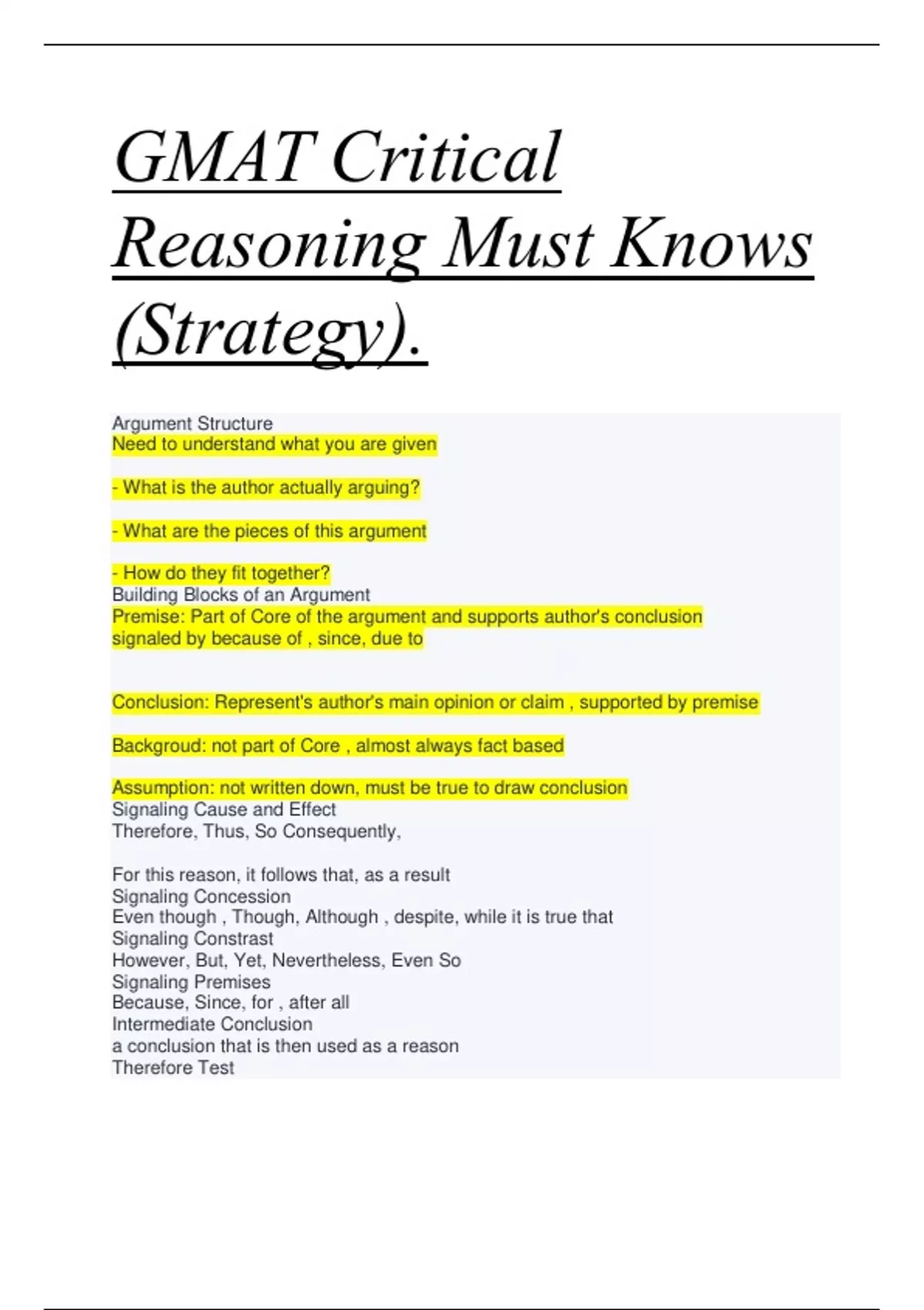 a technique which inserts because and therefore between two claims to see which is the intermediate conclusion vs final conclusion 4 step approach 1. Identify the question 2. Deconstruct the argument 3. State the goal 4. Work from wrong to right Identify the Question (What type of question is this?) Structure Based Family: Think what pieces are included in the argument and how do they fit (Describe the Role, Describe the Argument) Assumption Based Family: what must the author believe to be true for the argument to work (Find the assumption, Stregthen the argument , weaken the argument, evaluate the argument and find the flaw) Evidence Based Family: No conclusion , identifying something that must be true based on the passage , (Inference or explain a descrepancy) Deconstruct the Argument Break down passages , write notes on the side to help deconstruct the arguments, look for missing assumptions circle words like because , therefore , since State the Goal What exactly are you trying to do when you answer the question? Working from Wrong to Right Mark down ABCDE and cross as i figure out which answers are completly wrong Structure Based Family Questions The goal of these questions is to be able to identify the role played by specific information or the logic underlying the argument Describe the Role Questions Boldface: one or two parts of argument will be bolded and you are asked to describe the role each part plays Primary Method to Answer Boldface Questions (More Time) Labeling C: Conclusion P: Premise X: Other ( counter premise, background etc) Once you have labeled the bolded parts look for an answer that matches it