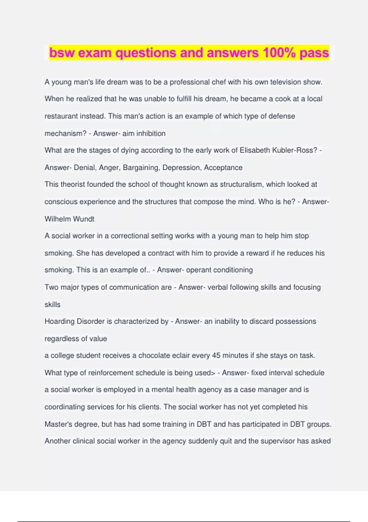 bsw exam questions and answers 100% pass A young man's life dream was to be a professional chef with his own television show. When he realized that he was unable to fulfill his dream, he became a cook at a local restaurant instead. This man's action is an example of which type of defense mechanism? - Answer- aim inhibition What are the stages of dying according to the early work of Elisabeth Kubler-Ross? - Answer- Denial, Anger, Bargaining, Depression, Acceptance This theorist founded the school of thought known as structuralism, which looked at conscious experience and the structures that compose the mind. Who is he? - Answer- Wilhelm Wundt A social worker in a correctional setting works with a young man to help him stop smoking. She has developed a contract with him to provide a reward if he reduces his smoking. This is an example of.. - Answer- operant conditioning Two major types of communication are - Answer- verbal following skills and focusing skills Hoarding Disorder is characterized by - Answer- an inability to discard possessions regardless of value a college student receives a chocolate eclair every 45 minutes if she stays on task. What type of reinforcement schedule is being used> - Answer- fixed interval schedule a social worker is employed in a mental health agency as a case manager and is coordinating services for his clients. The social worker has not yet completed his Master's degree, but has had some training in DBT and has participated in DBT groups. Another clinical social worker in the agency suddenly quit and the supervisor has asked this social worker to take over the established DBT therapeutic group of clients. If the SW provides this treatment which of the following is accurate> - Answer- it is not appropriate for a bachelor's level SW to provide clinical or psychotherapeutic treatment for which he is not qualified or licensed A SW, who is not a NASW member, has a private carpentry business in addition to his SW practice. he asked his social work clients to refer their friends to him who need carpentry work done. What is the best answer - Answer- this request is a violation of the NASW code of ethics according to sigmund, consciousness is the whole of everything of which one is aware. accepting this, which of the following is the potential of everything one can remember easily, but is not currently at a conscious level? - Answer- preconscious a male client is meeting with a social worker for the first time. the SW notes that the client talks quickly through the intake and is not interested in her input through the first 45 minutes. among the client's concerns is that he is being spied on through his peepholes in his apartment and that there is a conspiracy within the complex to have him evicted. the SW can best establish rapport w the client by - Answer- asking the client ways in which the SW can be helpful w these problems harry harlow's research with the rhesus monkeys revealed the importance of _______ on early development - Answer- love all of the following are true statements regarding a culturally competent social worker except - Answer- the social worker is aware of his or her own heritage, values, beliefs, and biases, and shares these openly with clients a scaffolding learning concept in children is defined as - Answer- an experienced adult providing assistance to a child who is trying to learn a difficult task most commonly reported form of elder abuse - Answer- neglect recent budget cuts have necessitated a policy change in the client fee strucutre at a mental health agency. subsequently, a social worker is concerned that low-income clients will be significantly affected in a way taht could reduce needed services. what should the social worker do first - Answer- speak with the supervisor and budgeting staff in an effort to advocate for low-income clients a rat is shocked until it presses a lever in the cage, resulting in the termination of the shock. when the rat lets go of the lever, the shock starts again. therefore, the rat learns to hold down the lever in order to avoid being shocked. this behavior is as a result of - Answer- negative reinforcement characteristics of attachment except: secure base,