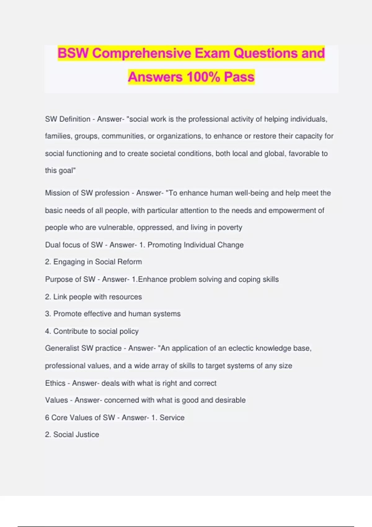 BSW Comprehensive Exam Questions and Answers 100% Pass SW Definition - Answer- "social work is the professional activity of helping individuals, families, groups, communities, or organizations, to enhance or restore their capacity for social functioning and to create societal conditions, both local and global, favorable to this goal" Mission of SW profession - Answer- "To enhance human well-being and help meet the basic needs of all people, with particular attention to the needs and empowerment of people who are vulnerable, oppressed, and living in poverty Dual focus of SW - Answer- 1. Promoting Individual Change 2. Engaging in Social Reform Purpose of SW - Answer- 1.Enhance problem solving and coping skills 2. Link people with resources 3. Promote effective and human systems 4. Contribute to social policy Generalist SW practice - Answer- "An application of an eclectic knowledge base, professional values, and a wide array of skills to target systems of any size Ethics - Answer- deals with what is right and correct Values - Answer- concerned with what is good and desirable 6 Core Values of SW - Answer- 1. Service 2. Social Justice 3. Dignity and Worth-of the Person 4. Importance of Human Relationships 5. Integrity 6. Competence Service - Answer- help, resources, benefits Social Justice - Answer- equal rights, protection, opportunities, obligations, and social benefits Dignity and Worth of the Person - Answer- holding high esteem and appreciating individual value Importance of Human Relationships - Answer- reciprocal interactions Integrity - Answer- trustworthiness and adherence to moral ideals Competence - Answer- having necessary skill and abilities to work effectively with client Ethical Standards and Professional Responsibilities - Answer- To Clients To Colleagues In Practice Settings As Professionals To the Social Work Profession To the Broader Society Diversity - Answer- the vast range of differences among people Planned Change Process - Answer- 1. Engagement 2. Assessment 3. Planning 4. Implementation