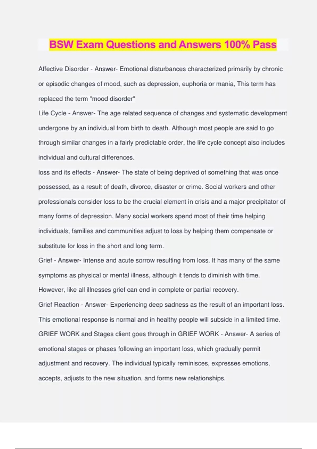 BSW Exam Questions and Answers 100% Pass Affective Disorder - Answer- Emotional disturbances characterized primarily by chronic or episodic changes of mood, such as depression, euphoria or mania, This term has replaced the term "mood disorder" Life Cycle - Answer- The age related sequence of changes and systematic development undergone by an individual from birth to death. Although most people are said to go through similar changes in a fairly predictable order, the life cycle concept also includes individual and cultural differences. loss and its effects - Answer- The state of being deprived of something that was once possessed, as a result of death, divorce, disaster or crime. Social workers and other professionals consider loss to be the crucial element in crisis and a major precipitator of many forms of depression. Many social workers spend most of their time helping individuals, families and communities adjust to loss by helping them compensate or substitute for loss in the short and long term. Grief - Answer- Intense and acute sorrow resulting from loss. It has many of the same symptoms as physical or mental illness, although it tends to diminish with time. However, like all illnesses grief can end in complete or partial recovery. Grief Reaction - Answer- Experiencing deep sadness as the result of an important loss. This emotional response is normal and in healthy people will subside in a limited time. GRIEF WORK and Stages client goes through in GRIEF WORK - Answer- A series of emotional stages or phases following an important loss, which gradually permit adjustment and recovery. The individual typically reminisces, expresses emotions, accepts, adjusts to the new situation, and forms new relationships. Separation & types of separation - Answer- The breaking off of a tie or relationship. Social workers use this term in several contexts, including marital separation (a husband and wife living in different residences), legal separation anxiety and separation individuation. Separation Anxiety - Answer- The fear that a young child experiences when threatened by the loss of the primary caregiver. This fear decreases as the child gets older but often returns during acute stress, crisis, or life stage transitions. Older children and adults sometimes suffer separation anxiety. Separation Individuation - Answer- According to Margaret Mahler, a psychosocial stage in human development in which the young child develops a sense of self identity and a recognition that he or she is distinct from the mother. Crisis Sequence (Stages) - Answer- 1. The hazardous event: A stressor that may be a single catastrophic event or a series of mishaps that have a cumulative event. 2. Vulnerable State: Heightened tension and anxiety caused by the hazardous event, intensified as the individual uses the entire repertoire of coping techniques before seeing that they do not work in this new situation 3 Precipitating Factor: The "last straw" often seen as the presenting problem or event that brings tension to a peak 4. Active Crisis State: Disequilibrium has set in and is manifested by psychological and physical turmoil, aimless activity, disturbance in mood and intellectual functioning and painful preoccupation w. events leading to crisis event 5. Reintegration: The individual adjusts or accepts and learns new and effective coping techniques, a phase that may be adaptive or maladaptive. Coping Index - Answer- One of several rating systems that social workers use to rank the degree of coping skills or resources a client can call on to