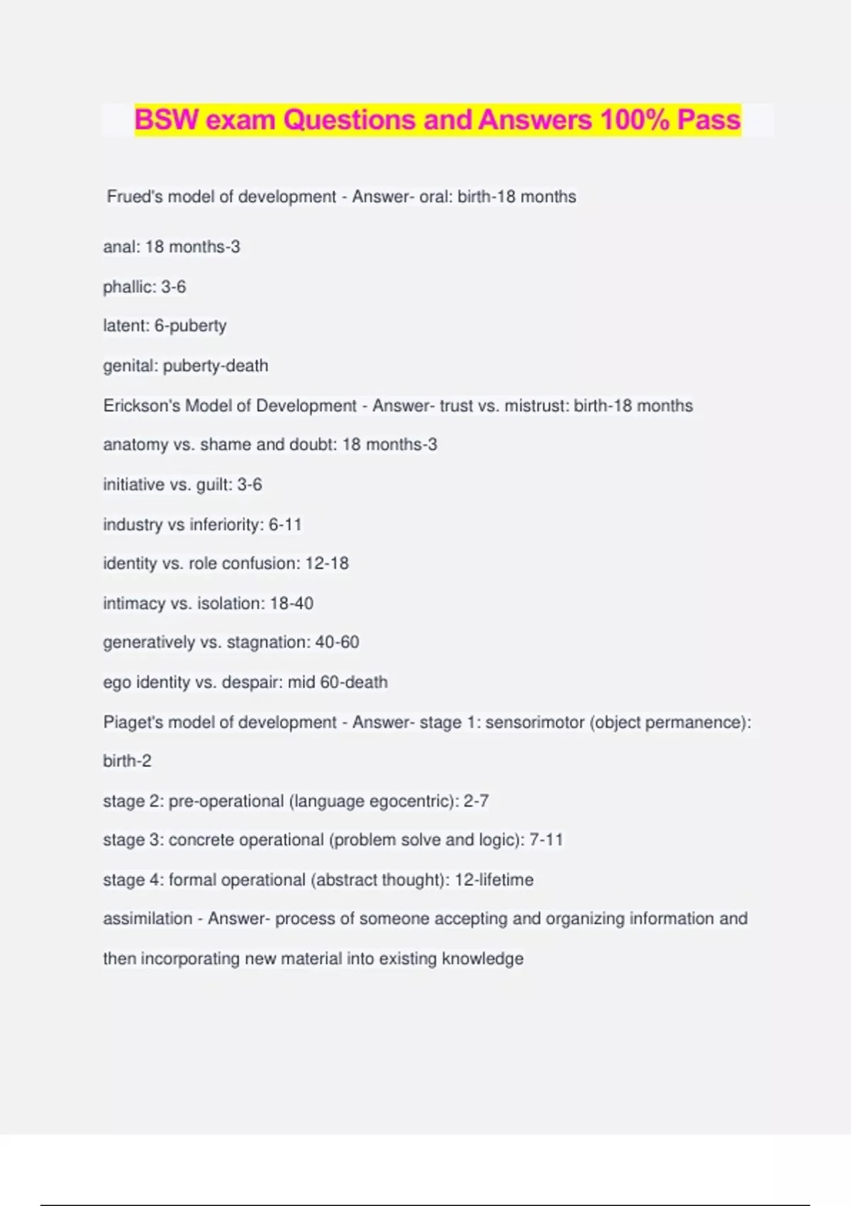 BSW exam Questions and Answers 100% Pass Frued's model of development - Answer- oral: birth-18 months anal: 18 months-3 phallic: 3-6 latent: 6-puberty genital: puberty-death Erickson's Model of Development - Answer- trust vs. mistrust: birth-18 months anatomy vs. shame and doubt: 18 months-3 initiative vs. guilt: 3-6 industry vs inferiority: 6-11 identity vs. role confusion: 12-18 intimacy vs. isolation: 18-40 generatively vs. stagnation: 40-60 ego identity vs. despair: mid 60-death Piaget's model of development - Answer- stage 1: sensorimotor (object permanence): birth-2 stage 2: pre-operational (language egocentric): 2-7 stage 3: concrete operational (problem solve and logic): 7-11 stage 4: formal operational (abstract thought): 12-lifetime assimilation - Answer- process of someone accepting and organizing information and then incorporating new material into existing knowledge accommodation - Answer- old ideas must be changed or replaced due to obtaining new information from the environment schemas - Answer- a set of thoughts and ideas and perceptions that fit together and are constantly challanged by gaining new information and creating change through knowledge BF Skinner Operant Conditioning - Answer- behavior reinforced will increase and behavior punished with decrease positive reinforcement - Answer- reward negative reinforcement - Answer- unpleasant stimulus that is removed when behavior is elicited, man cutting grass to get wife to stop nagging punishment - Answer- unpleasant response from environment, ex: speeding ticket superstition - Answer- incorrect perception that one stimulus is connected to another. shaping - Answer- changing behavior gradually by rewarding approximations of behavior ex: rewarding rat for moving closer to lever social clock theory - Answer- society has expectations for life events and people experience stress if they are not on mark for their age zone of proximal development - Answer- the range of tasks a child can carry out with assistance, but not independently Id - Answer- primitive part of human psyche based on instinct, unconscious mind, pleasure principle, seeking immediate gratification, babies ego - Answer- meeting needs of id in socially acceptable manner, allows one to consider pros and cons, to have awareness of others' feelings, delay gratification when necessary super ego - Answer- internal moral system or sense of right and wrong, suppresses instincts of id and convinces ego to act idealistically, Maslow's hierarchy of needs - Answer- physiological, safety, love and belonging, esteem, self-actualization displacement - Answer- displacing feelings about or towards so