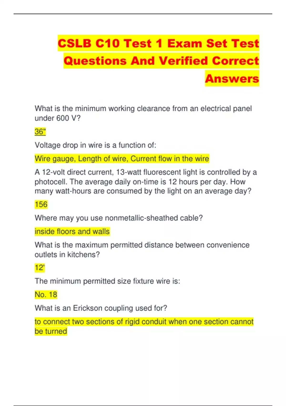 CSLB C10 Test 1 Exam Set Test Questions And Verified Correct Answers What is the minimum working clearance from an electrical panel under 600 V? 36" Voltage drop in wire is a function of: Wire gauge, Length of wire, Current flow in the wire A 12-volt direct current, 13-watt fluorescent light is controlled by a photocell. The average daily on-time is 12 hours per day. How many watt-hours are consumed by the light on an average day? 156 Where may you use nonmetallic-sheathed cable? inside floors and walls What is the maximum permitted distance between convenience outlets in kitchens? 12' The minimum permitted size fixture wire is: No. 18
