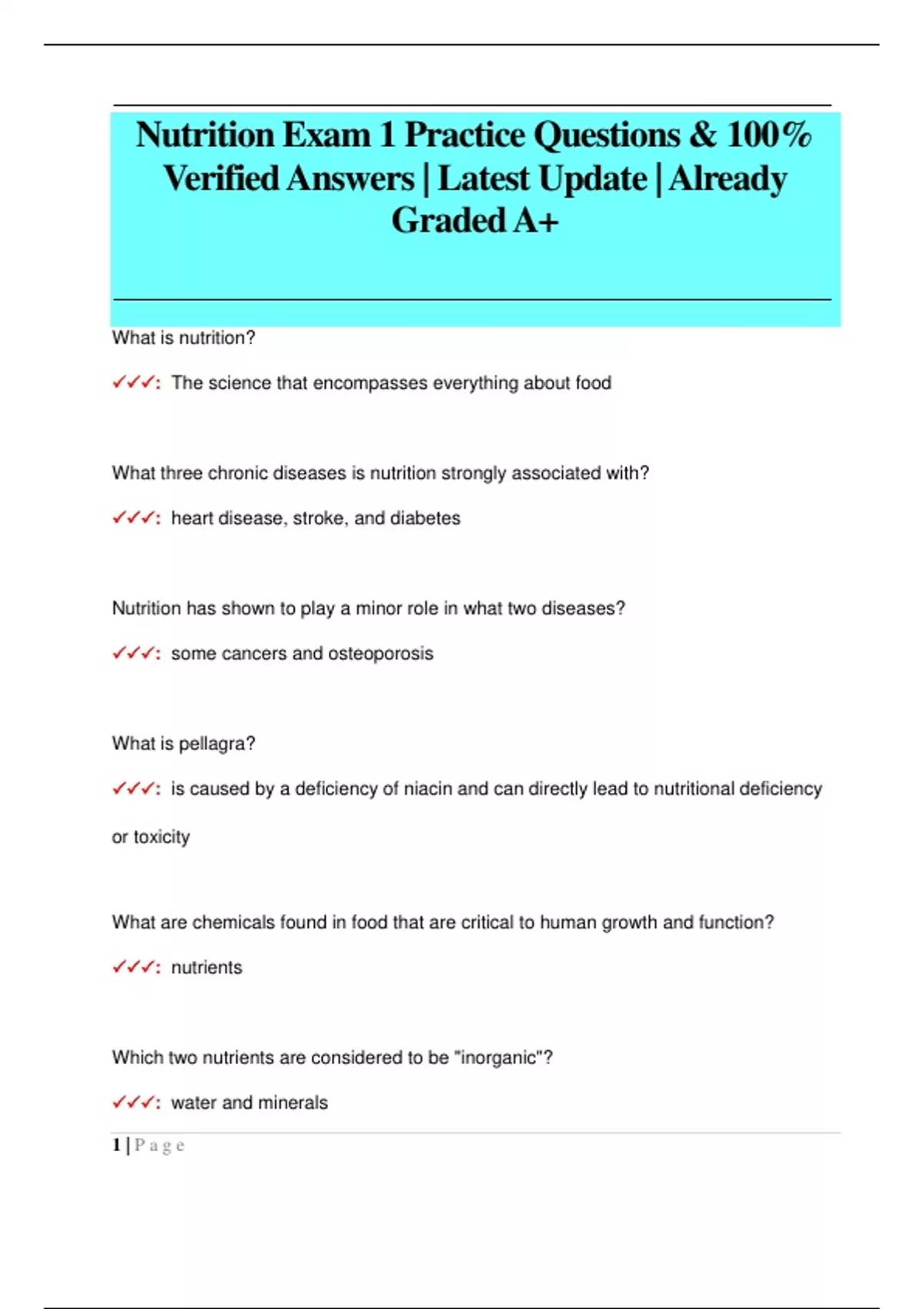 Nutrition Exam 1 Practice Questions & 100% Verified Answers | Latest Update | Already Graded A+