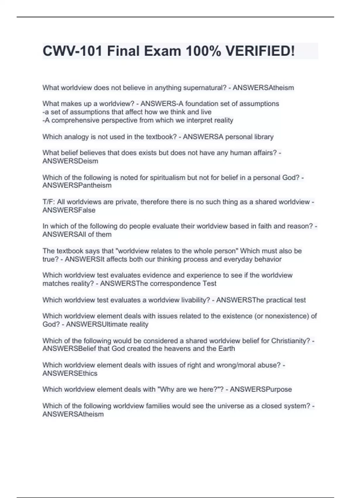 What worldview does not believe in anything supernatural? - ANSWERSAtheism What makes up a worldview? - ANSWERS-A foundation set of assumptions -a set of assumptions that affect how we think and live -A comprehensive perspective from which we interpret reality Which analogy is not used in the textbook? - ANSWERSA personal library What belief believes that does exists but does not have any human affairs? - ANSWERSDeism Which of the following is noted for spiritualism but not for belief in a personal God? - ANSWERSPantheism T/F: All worldviews are private, therefore there is no such thing as a shared worldview - ANSWERSFalse In which of the following do people evaluate their worldview based in faith and reason? - ANSWERSAll of them The textbook says that "worldview relates to the whole person" Which must also be true? - ANSWERSIt affects both our thinking process and everyday behavior Which worldview test evaluates evidence and experience to see if the worldview matches reality? - ANSWERSThe correspondence Test Which worldview test evaluates a worldview livability? - ANSWERSThe practical test Which worldview element deals with issues related to the existence (or nonexistence) of God? - ANSWERSUltimate reality Which of the following would be considered a shared worldview belief for Christianity? - ANSWERSBelief that God created the heavens and the Earth Which worldview element deals with issues of right and wrong/moral abuse? - ANSWERSEthics Which worldview element deals with "Why are we here?"? - ANSWERSPurpose Which of the following worldview families would see the universe as a closed system? - ANSWERSAtheism T/F: "Each man doing what is right in his own eyes" implies that people were sinful and