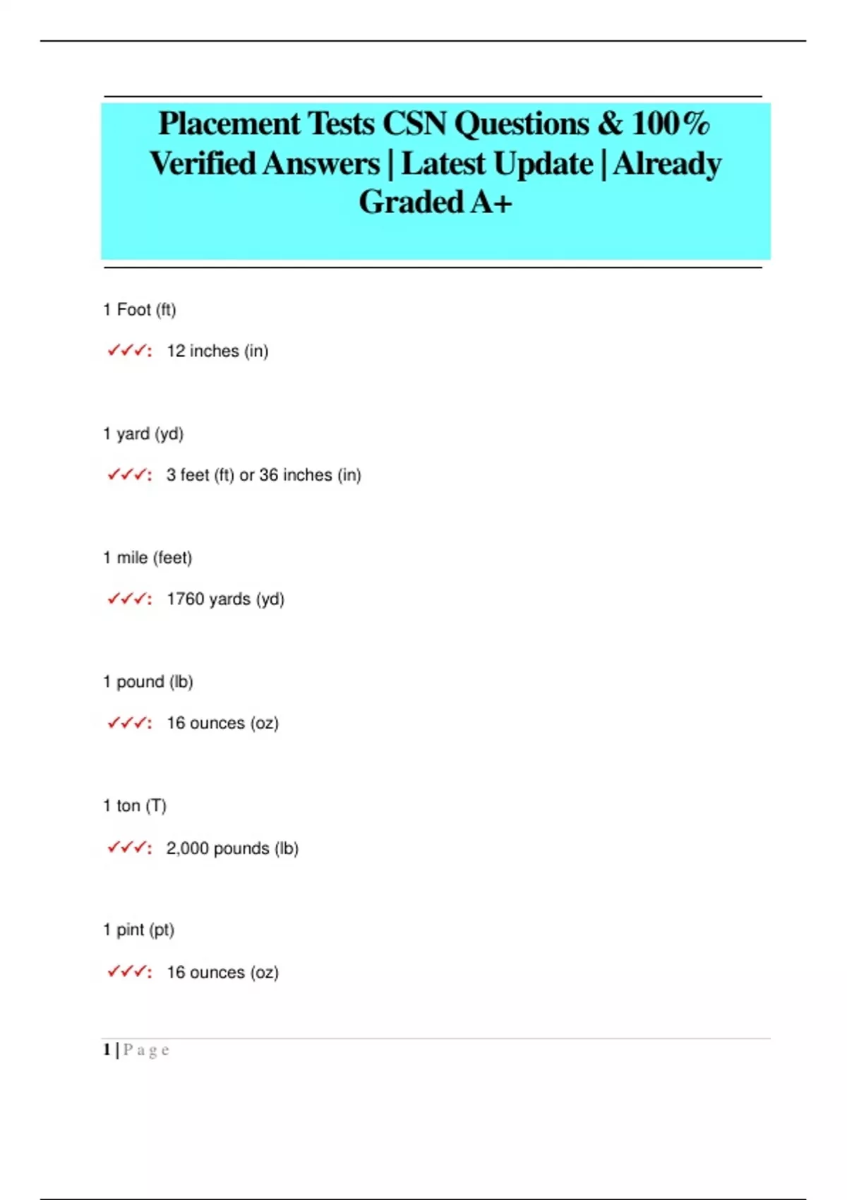 1 Foot (ft) : 12 inches (in) 1 yard (yd) : 3 feet (ft) or 36 inches (in) 1 mile (feet) : 1760 yards (yd) 1 pound (lb) : 16 ounces (oz) 1 ton (T) : 2,000 pounds (lb) 1 pint (pt) : 16 ounces (oz) 2 | P a g e 1 quart (qt) : 2 pints (pt) or 4 cups (c) 1 gallon (gal) : 4 quarts (qt) 1 gallon (gal) : 128 ounces (oz) 1 centimeter (cm) : 10 millimeters (mm) 1 decimeter (dm) : 10 centimeters (cm) 1 meter (m) : 10 decimeters (dm) or 100 centimeters (cm) or 1,000 millimeters (mm