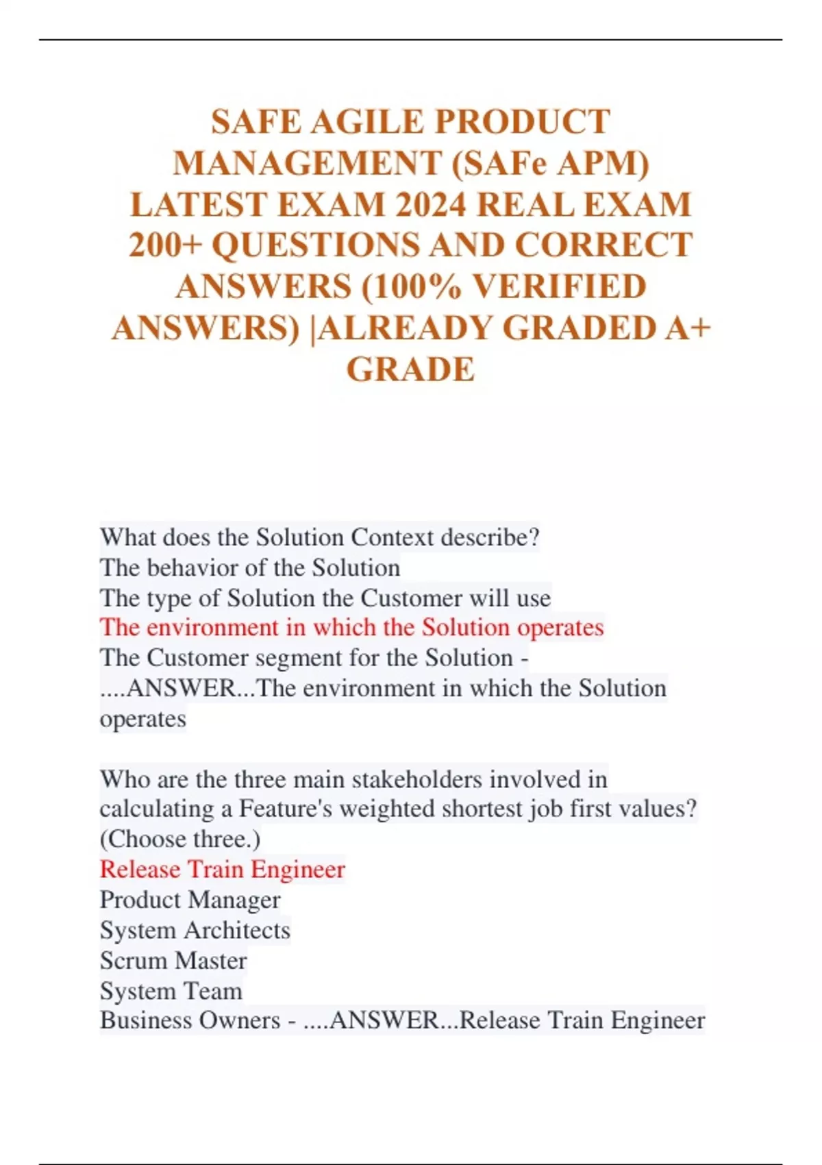 SAFE AGILE PRODUCT MANAGEMENT (SAFe APM) LATEST EXAM 2024 REAL EXAM 200+ QUESTIONS AND CORRECT ANSWERS (100% VERIFIED ANSWERS) |ALREADY GRADED A+ GRADE
