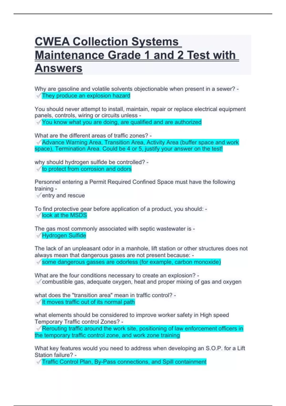 CWEA Collection Systems Maintenance Grade 1 and 2 Test with Answers