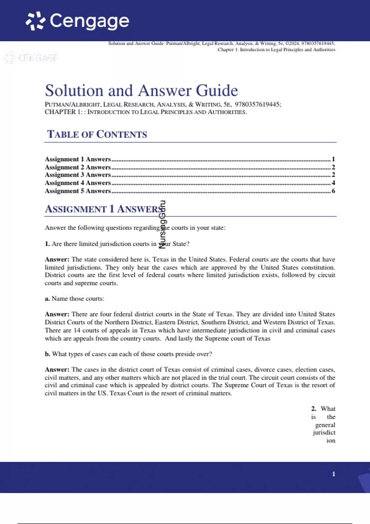 Solution Manual for Legal Research, Analysis, and Writing, 5th Edition by William H. Putman, JDJennifer R. Albright, JD, LLM