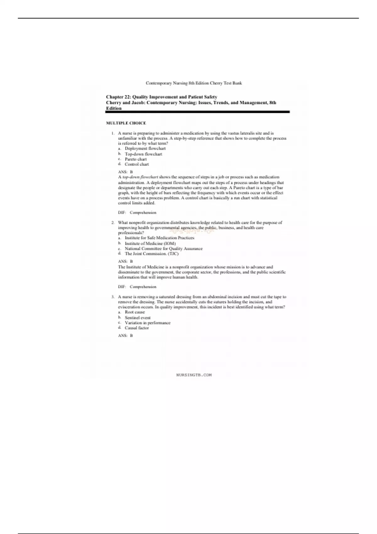 This is a detailed, quality and well sorted out test bank that focuses on Chapter 22; Quality improvement and patient safety ..Basically test questions that will most likey be on the test. U can't afford to miss this, Cuz it will help to ace your tests and boost your grades, at a price that's worth it!! The Price won't last long!! Don't be late!!