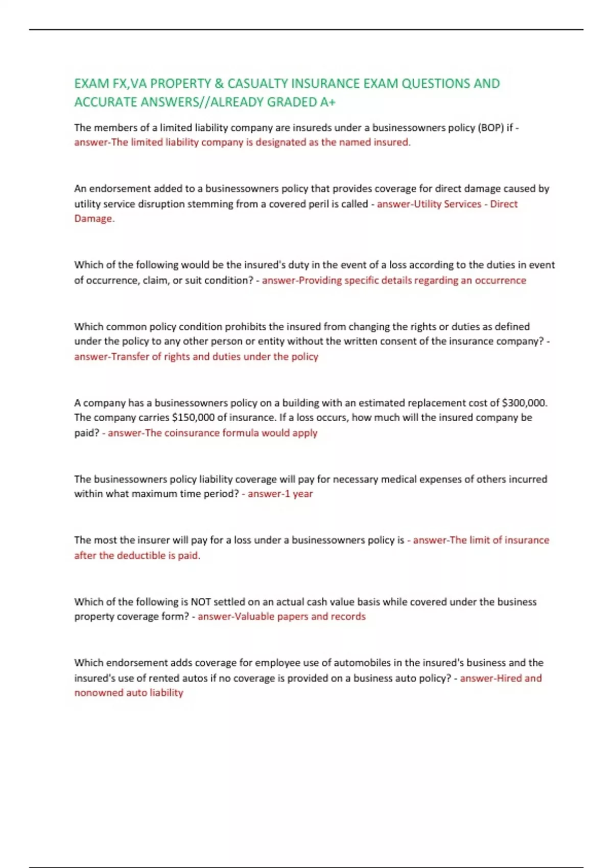 EXAM FX,VA PROPERTY & CASUALTY INSURANCE EXAM QUESTIONS AND ACCURATE ANSWERS//ALREADY GRADED A+