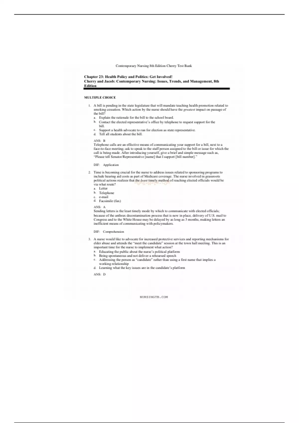 This is a detailed, quality and well sorted out test bank on chapter 23; health policy and politics for Nur 104. Basically test questions that will most likely be on the test. U can't afford to miss this, Cuz it will help to ace your tests and boost your grades, at price a that's worth it!! The Price won't last long!! Don't be late!!
