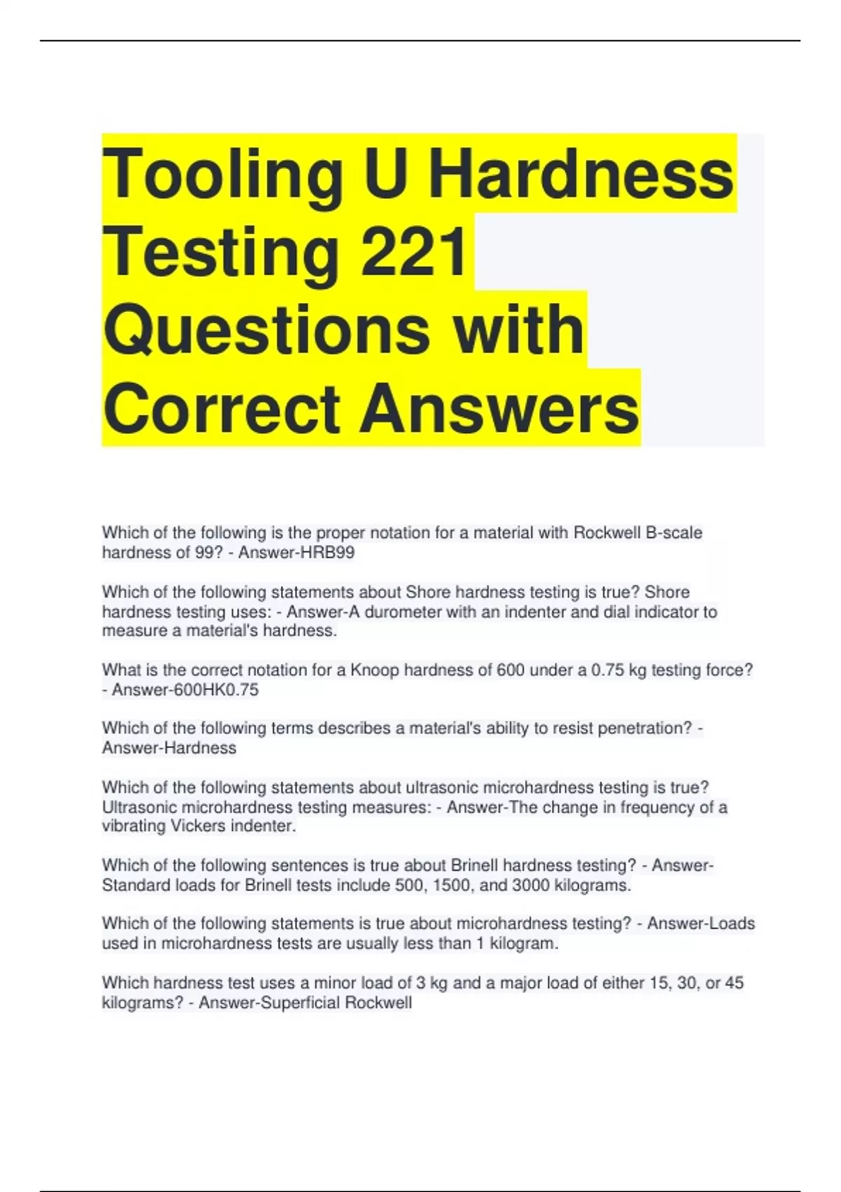 Tooling U Hardness Testing 221 Questions with Correct Answers (1) Which of the following is the proper notation for a material with Rockwell B-scale hardness of 99? - Answer-HRB99 Which of the following statements about Shore hardness testing is true? Shore hardness testing uses: - Answer-A durometer with an indenter and dial indicator to measure a material's hardness. What is the correct notation for a Knoop hardness of 600 under a 0.75 kg testing force? - Answer-600HK0.75 Which of the following terms describes a material's ability to resist penetration? - Answer-Hardness Which of the following statements about ultrasonic microhardness testing is true? Ultrasonic microhardness testing measures: - Answer-The change in frequency of a vibrating Vickers indenter. Which of the following sentences is true about Brinell hardness testing? - Answer- Standard loads for Brinell tests include 500, 1500, and 3000 kilograms. Which of the following statements is true about microhardness testing? - Answer-Loads used in microhardness tests are usually less than 1 kilogram. Which hardness test uses a minor load of 3 kg and a major load of either 15, 30, or 45 kilograms? - Answer-Superficial Rockwell Which test uses a pyramid indenter with a square base and loads between 1 and 120 kilograms? - Answer-Vickers Which hardness test measures the rebound of a diamond-tipped hammer that is dropped from a fixed height? - Answer-Scleroscope What is the proper notation for a material with a Brinell hardness of 523? - Answer- HB523 Which hardness testing method determines a hardness value after delivering a minor and major static load? - Answer-Rockwell Which of the following sentences about hardness testing methods is true? - Answer- Rebound methods measure how high or fast a hammer rebounds after being dropped on the test material. Which portable hardness testing method measures the rebound of a ball hammer that is bounced off of the material with a spring mechanism? - Answer-Leeb Which of the following statements about hardness data conversion is true? - Answer- Reference charts offer approximate comparisons of different hardness scales. Which of the following sentences about the Rockwell hardness test is true? - Answer- The first static load usually causes elastic deformation, while the second causes plastic deformation. Which of the following statements about hardness testing accuracy is true? - Answer- Devices must be cleaned and calibrated before testing begins. Which of the following statements describes Knoop hardness testing? Knoop hardness testing is: - Answer-A test that uses a pyramid indenter with a diagonal that is 7 times the length of the shorter diagonal.