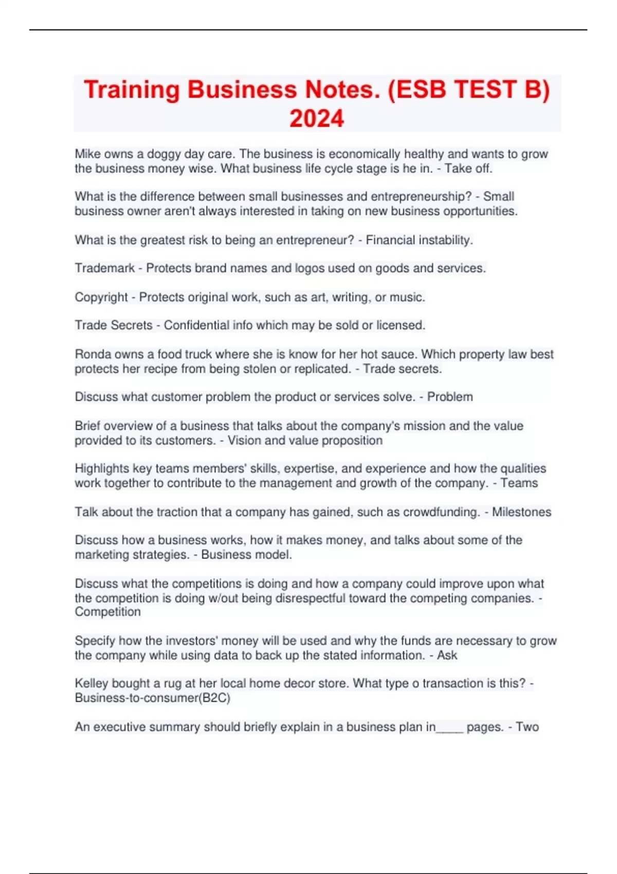 Mike owns a doggy day care. The business is economically healthy and wants to grow the business money wise. What business life cycle stage is he in. - Take off. What is the difference between small businesses and entrepreneurship? - Small business owner aren't always interested in taking on new business opportunities. What is the greatest risk to being an entrepreneur? - Financial instability. Trademark - Protects brand names and logos used on goods and services. Copyright - Protects original work, such as art, writing, or music. Trade Secrets - Confidential info which may be sold or licensed. Ronda owns a food truck where she is know for her hot sauce. Which property law best protects her recipe from being stolen or replicated. - Trade secrets. Discuss what customer problem the product or services solve. - Problem Brief overview of a business that talks about the company's mission and the value provided to its customers. - Vision and value proposition Highlights key teams members' skills, expertise, and experience and how the qualities work together to contribute to the management and growth of the company. - Teams Talk about the traction that a company has gained, such as crowdfunding. - Milestones Discuss how a business works, how it makes money, and talks about some of the marketing strategies. - Business model. Discuss what the competitions is doing and how a company could improve upon what the competition is doing w/out being disrespectful toward the competing companies. - Competition Specify how the investors' money will be used and why the funds are necessary to grow the company while using data to back up the stated information. - Ask Kelley bought a rug at her local home decor store. What type o transaction is this? - Business-to-consumer(B2C) An executive summary should briefly explain in a business plan in____ pages. - Two