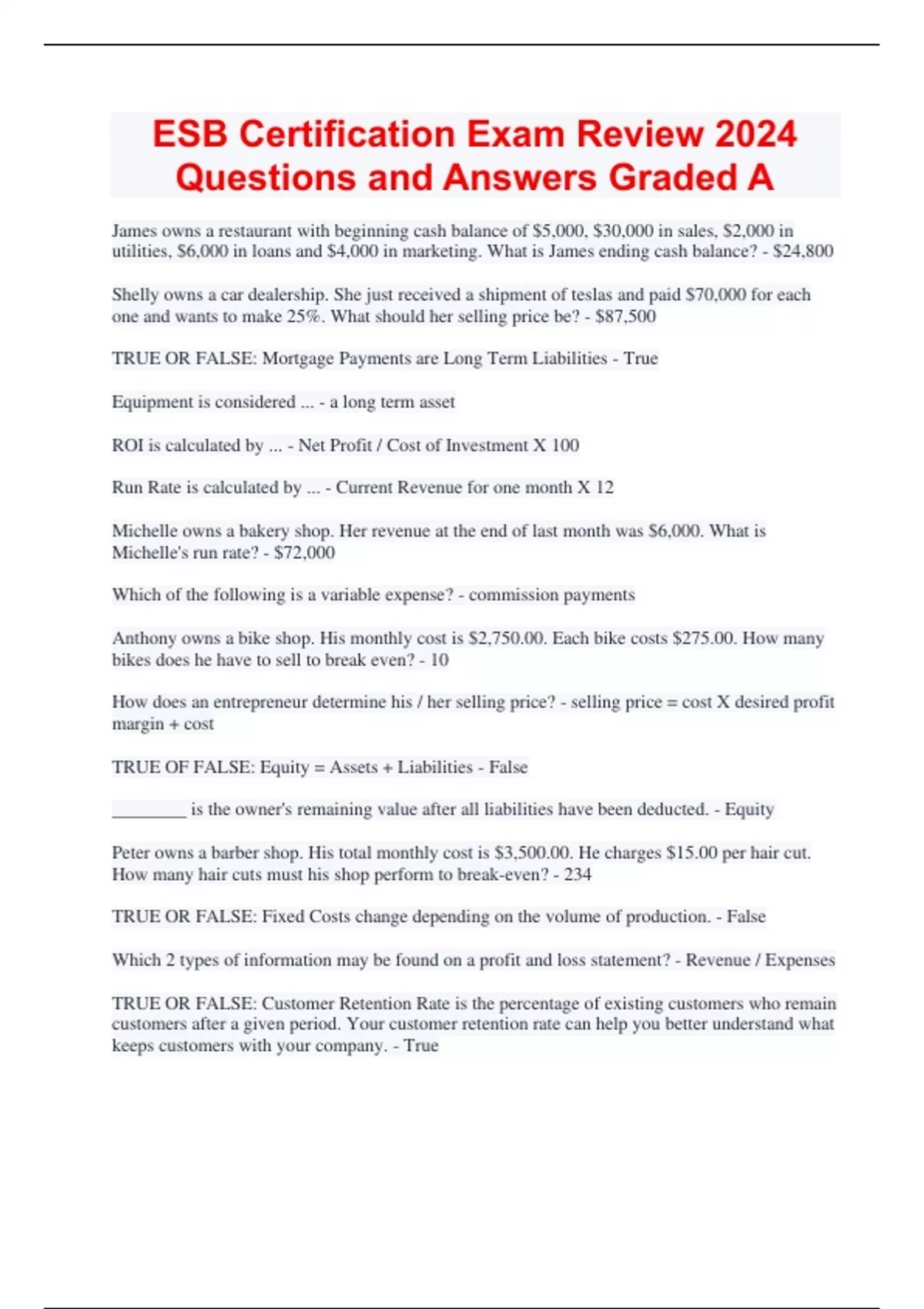 James owns a restaurant with beginning cash balance of $5,000, $30,000 in sales, $2,000 in utilities, $6,000 in loans and $4,000 in marketing. What is James ending cash balance? - $24,800 Shelly owns a car dealership. She just received a shipment of teslas and paid $70,000 for each one and wants to make 25%. What should her selling price be? - $87,500 TRUE OR FALSE: Mortgage Payments are Long Term Liabilities - True Equipment is considered ... - a long term asset ROI is calculated by ... - Net Profit / Cost of Investment X 100 Run Rate is calculated by ... - Current Revenue for one month X 12 Michelle owns a bakery shop. Her revenue at the end of last month was $6,000. What is Michelle's run rate? - $72,000 Which of the following is a variable expense? - commission payments Anthony owns a bike shop. His monthly cost is $2,750.00. Each bike costs $275.00. How many bikes does he have to sell to break even? - 10 How does an entrepreneur determine his / her selling price? - selling price = cost X desired profit margin + cost TRUE OF FALSE: Equity = Assets + Liabilities - False ________ is the owner's remaining value after all liabilities have been deducted. - Equity Peter owns a barber shop. His total monthly cost is $3,500.00. He charges $15.00 per hair cut. How many hair cuts must his shop perform to break-even? - 234 TRUE OR FALSE: Fixed Costs change depending on the volume of production. - False Which 2 types of information may be found on a profit and loss statement? - Revenue / Expenses TRUE OR FALSE: Customer Retention Rate is the percentage of existing customers who remain customers after a given period. Your customer retention rate can help you better understand what keeps customers with your company. - True