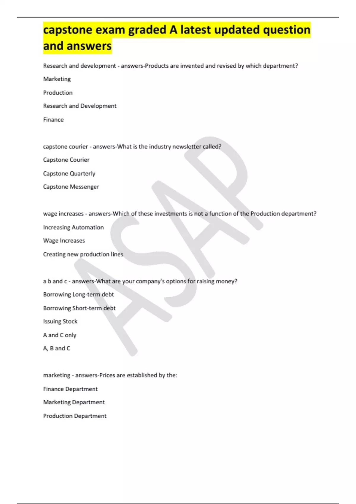 capstone exam graded A latest updated question and answers Research and development - answers-Products are invented and revised by which department? Marketing Production Research and Development Finance