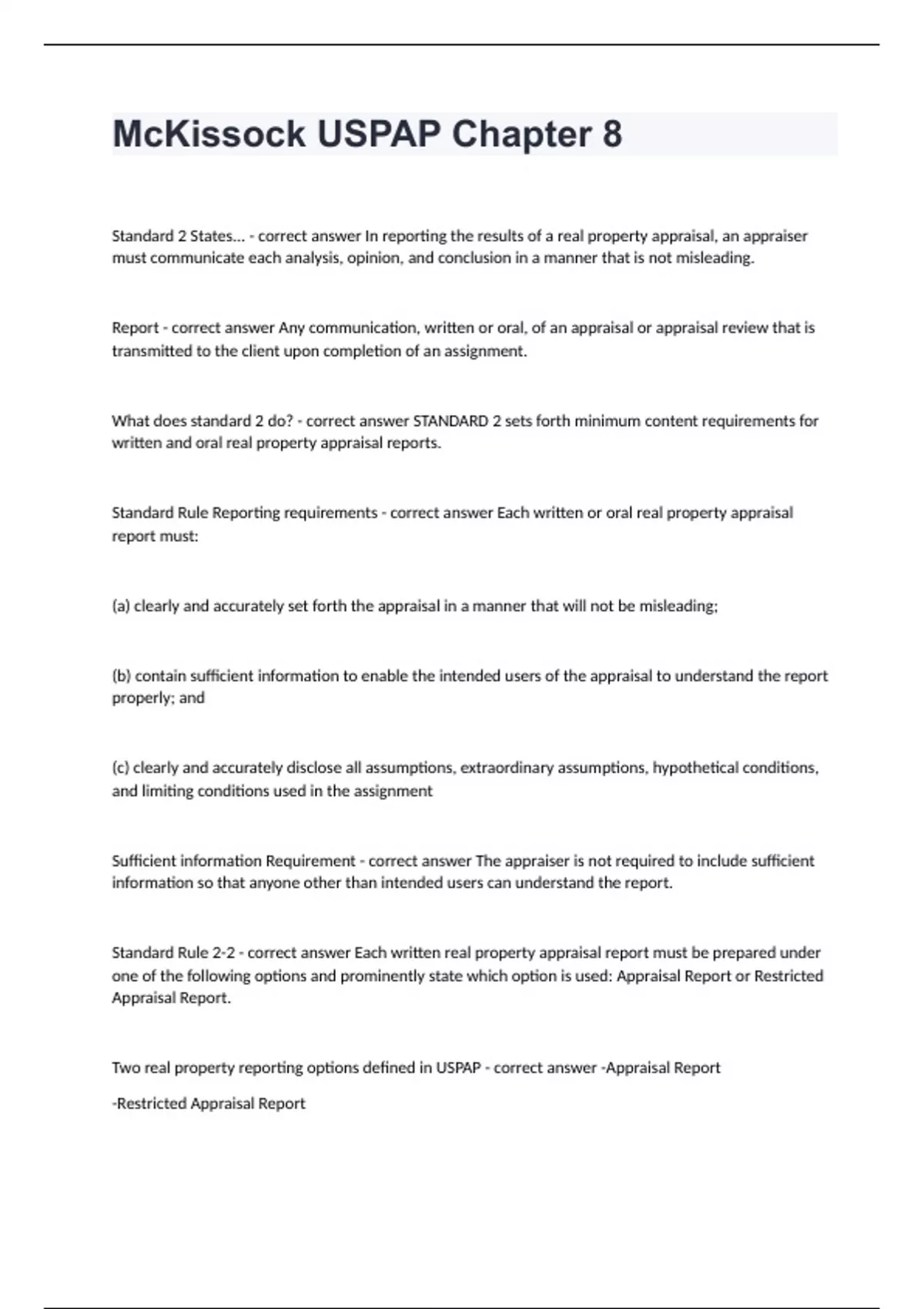 McKissock Liberty University -McKissock USPAP Chapter 8 questions with answers Standard 2 States... - correct answer In reporting the results of a real property appraisal, an appraiser must communicate each analysis, opinion, and conclusion in a manner that is not misleading. Report - correct answer Any communication, written or oral, of an appraisal or appraisal review that is transmitted to the client upon completion of an assignment. What does standard 2 do? - correct answer STANDARD 2 sets forth minimum content requirements for written and oral real property appraisal reports. Standard Rule Reporting requirements - correct answer Each written or oral real property appraisal report must: (a) clearly and accurately set forth the appraisal in a manner that will not be misleading; (b) contain sufficient information to enable the intended users of the appraisal to understand the report properly; and (c) clearly and accurately disclose all assumptions, extraordinary assumptions, hypothetical conditions, and limiting conditions used in the assignment Sufficient information Requirement - correct answer The appraiser is not required to include sufficient information so that anyone other than intended users can understand the report. Standard Rule 2-2 - correct answer Each written real property appraisal report must be prepared under one of the following options and prominently state which option is used: Appraisal Report or Restricted Appraisal Report. Two real property reporting options defined in USPAP - correct answer -Appraisal Report