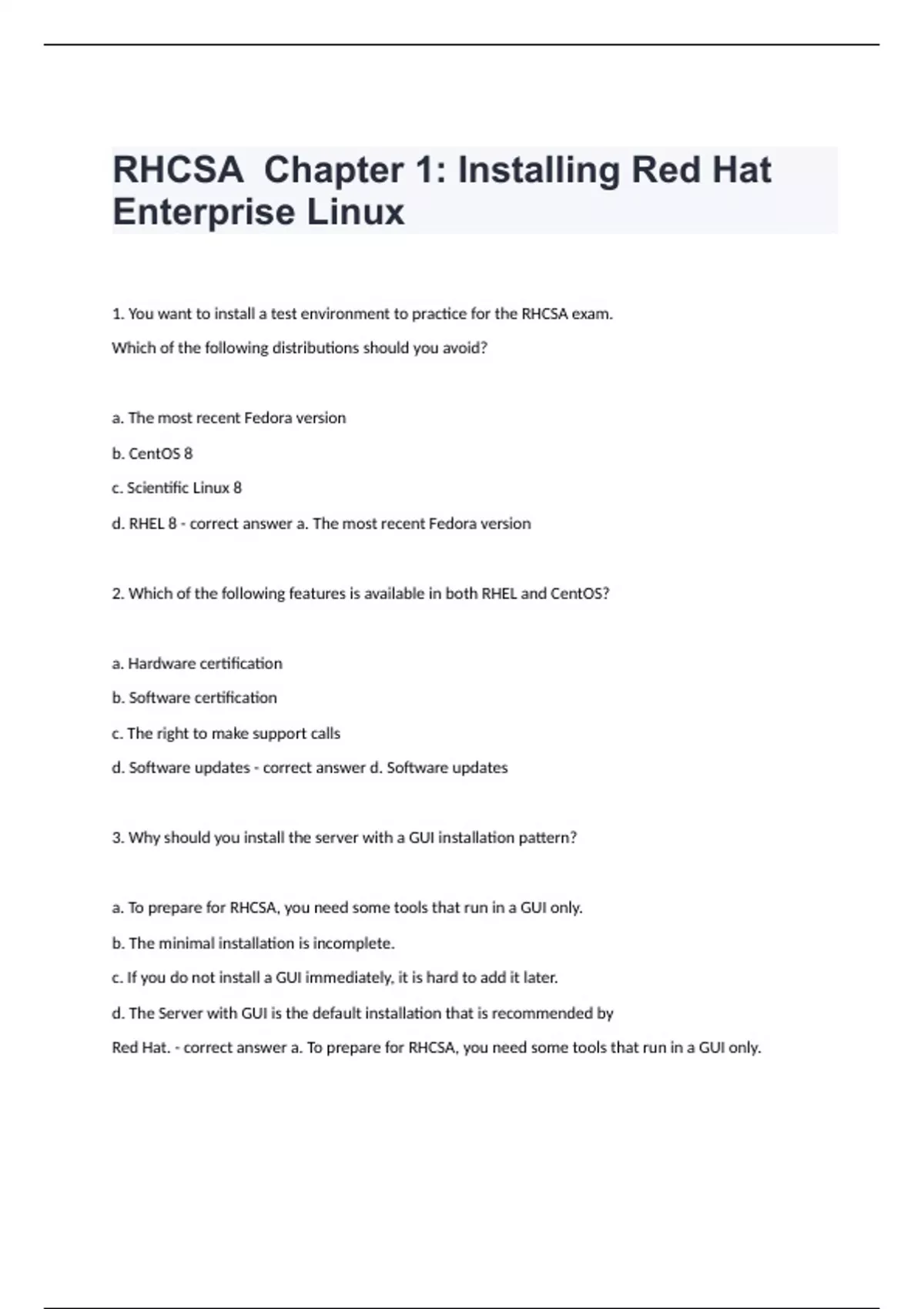 1. You want to install a test environment to practice for the RHCSA exam. Which of the following distributions should you avoid? a. The most recent Fedora version b. CentOS 8 c. Scientific Linux 8 d. RHEL 8 - correct answer a. The most recent Fedora version 2. Which of the following features is available in both RHEL and CentOS? a. Hardware certification b. Software certification c. The right to make support calls d. Software updates - correct answer d. Software updates 3. Why should you install the server with a GUI installation pattern? a. To prepare for RHCSA, you need some tools that run in a GUI only. b. The minimal installation is incomplete. c. If you do not install a GUI immediately, it is hard to add it later. d. The Server with GUI is the default installation that is recommended by Red Hat. - correct answer a. To prepare for RHCSA, you need some tools that run in a GUI only. 4. Which is the default file system that is used in RHEL 8? a. Ext3 b. Ext4 c. XFS d. Btrfs - correct answer c. XFS