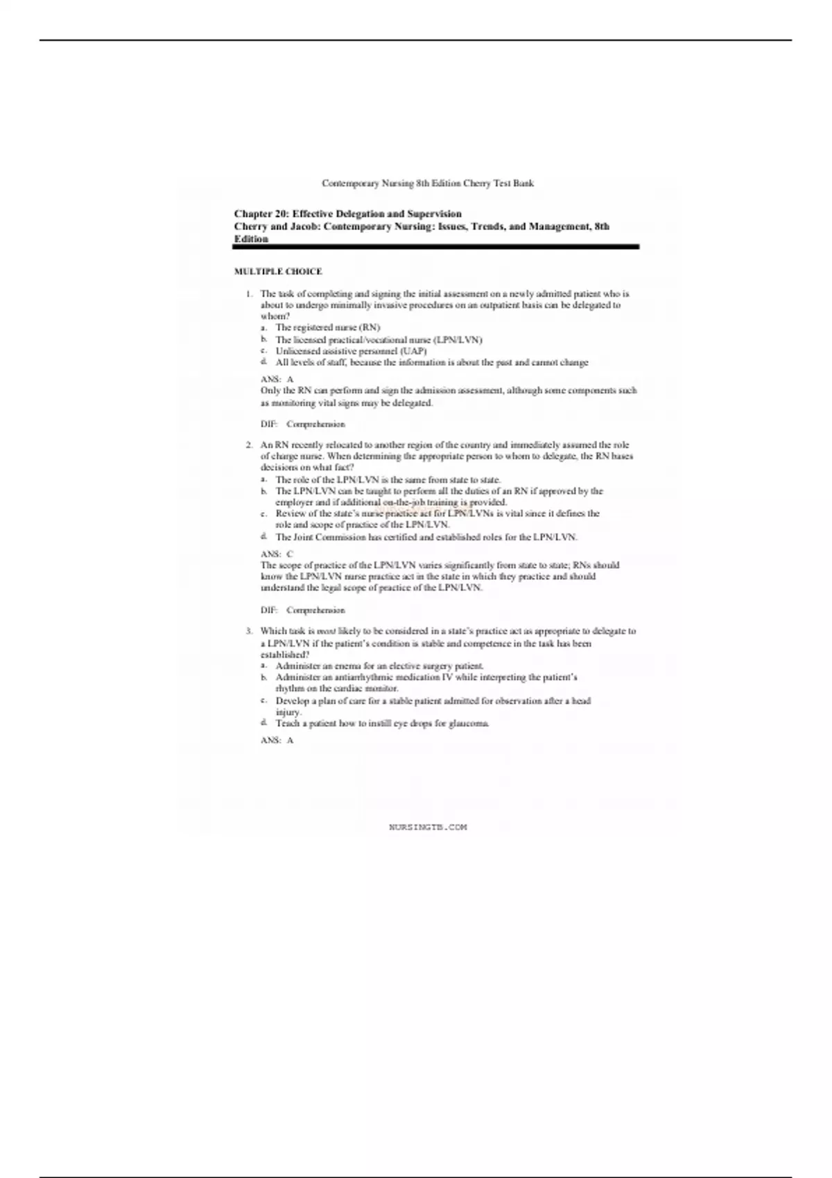 This is a detailed, quality and well sorted out test bank on chapter 20 ; effective delegation and supervision for Nur 104. Basically test questions that will most likely be on the test. U can't afford to miss this, Cuz it will help you ace your tests and boost your grades, at price a that's worth it!! The Price won't last long!! Don't be late!!